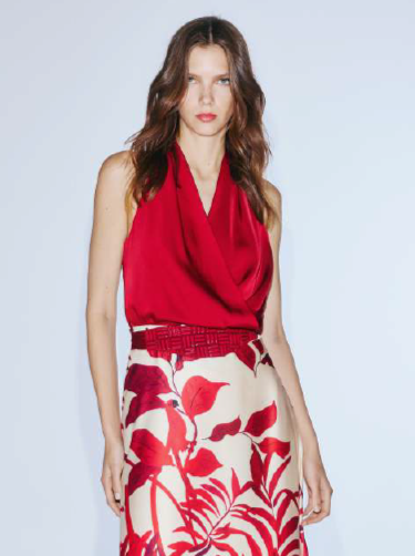 Blusa confeccionada en satén de color rojo con cuello halter.