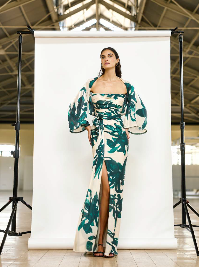 Vestido largo de fiesta confeccionado en gasa estampada.