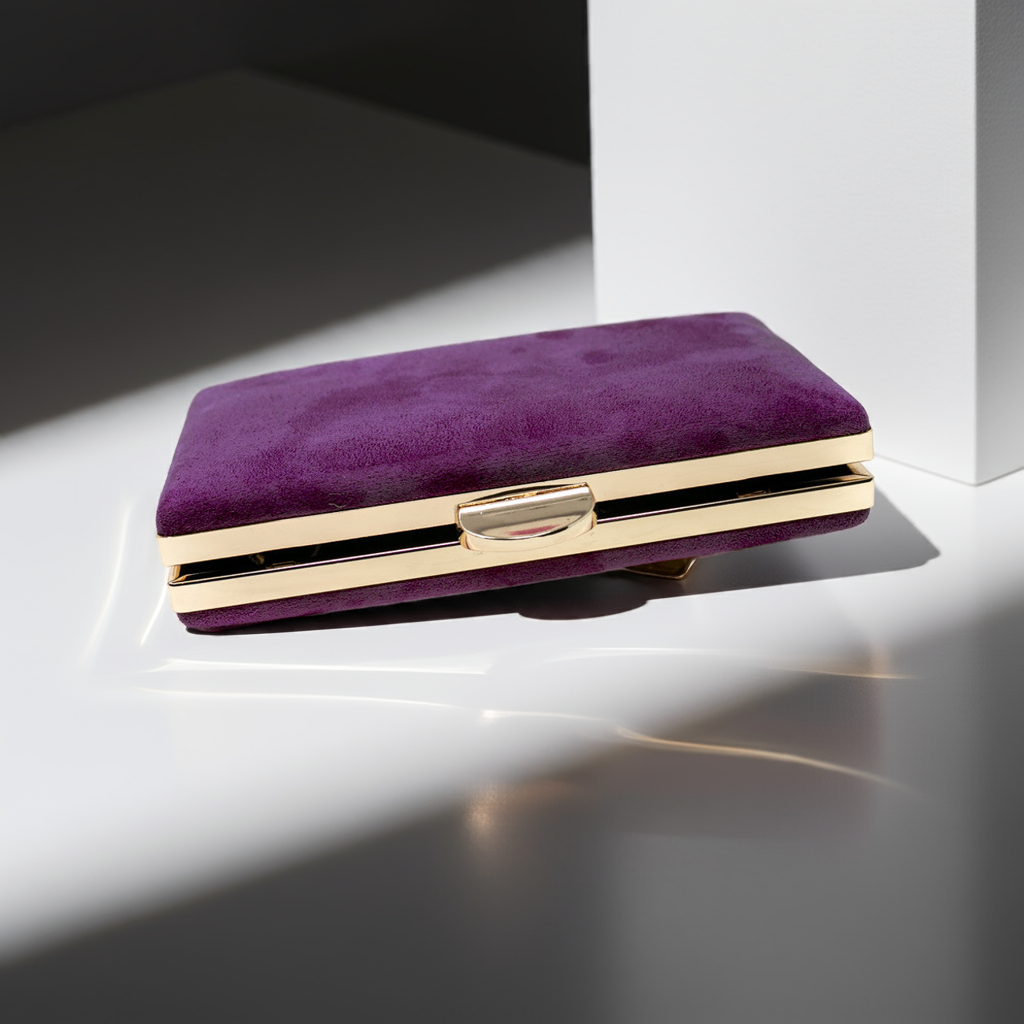 Cartera de fiesta de antelina en color morado.