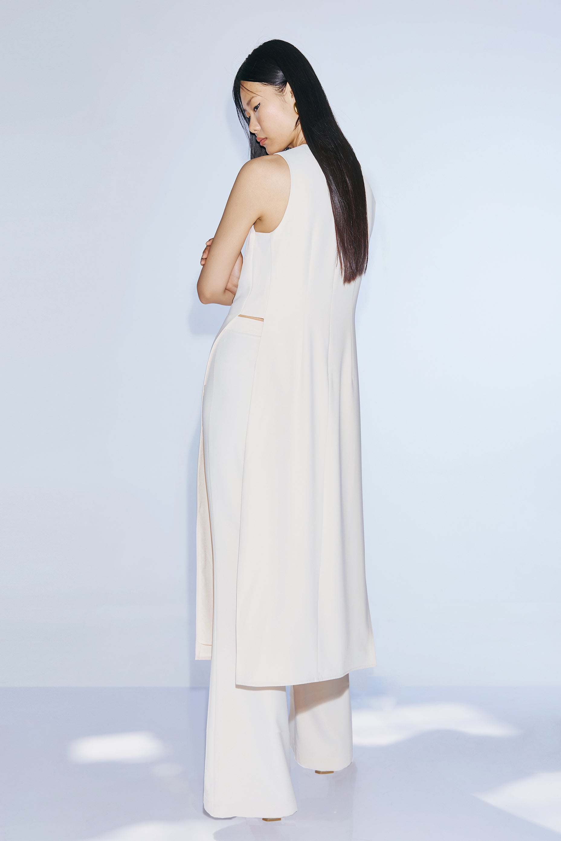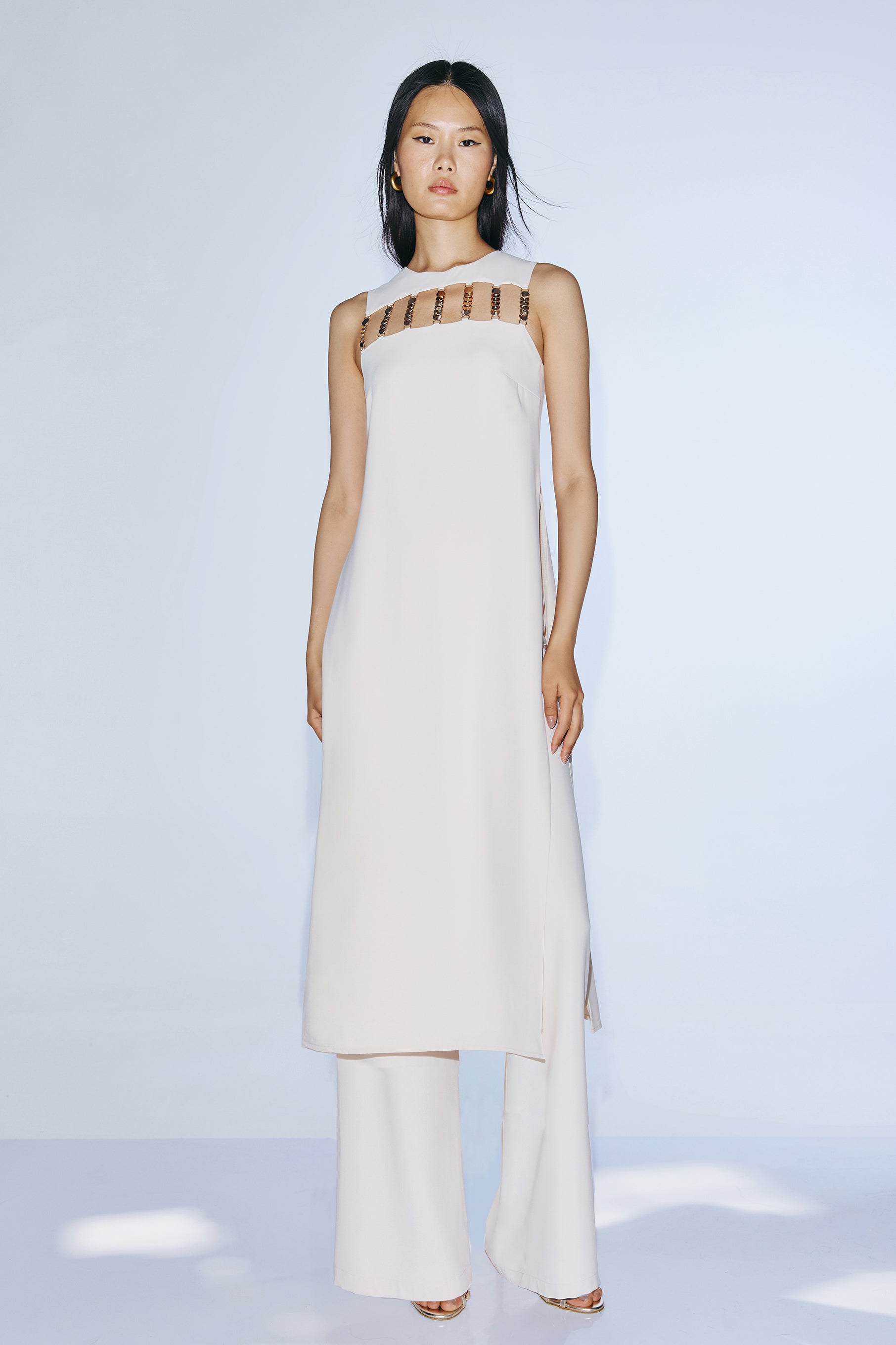 Conjunto de casaca y pantalón en color beige.