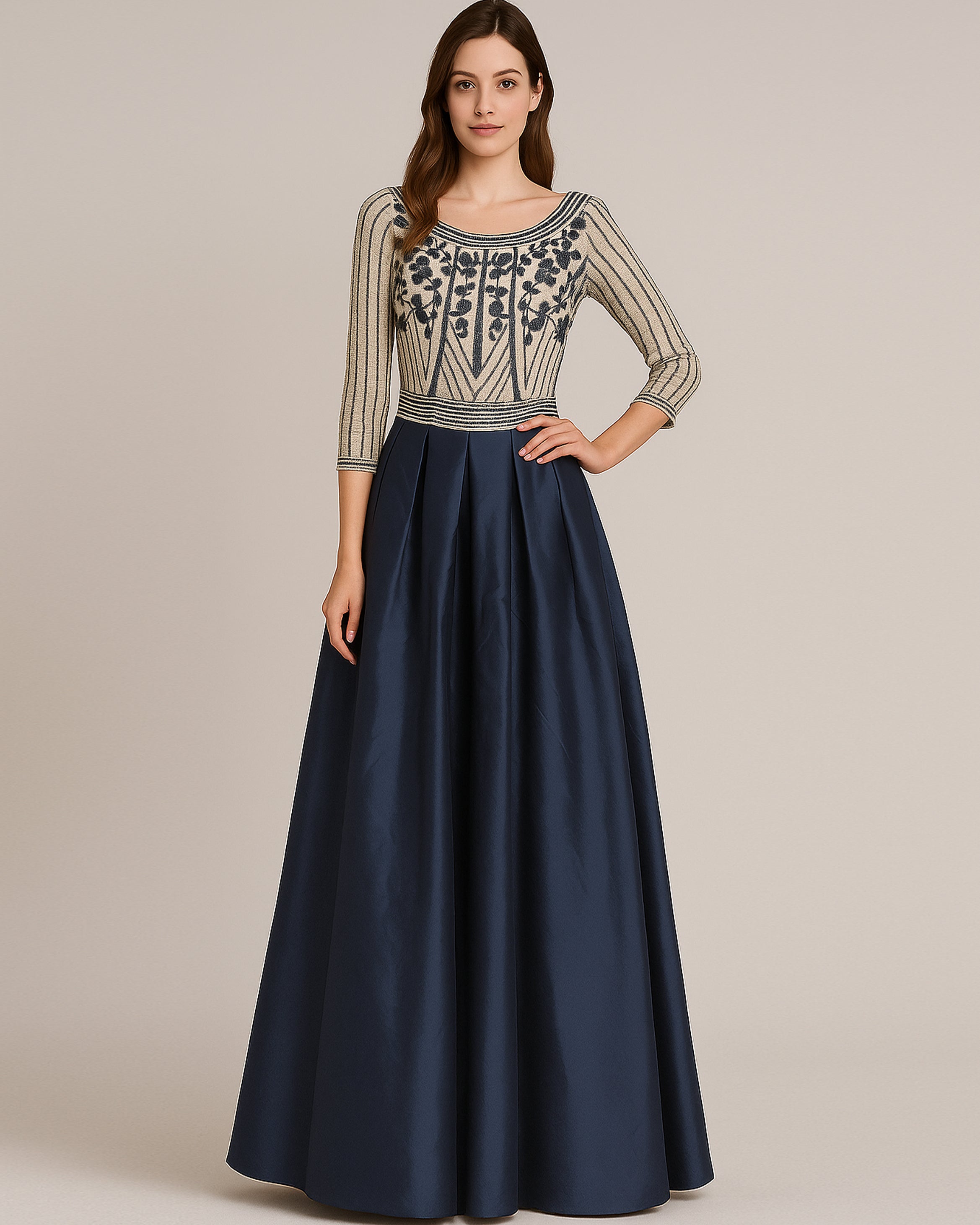 Vestido largo de fiesta con cuerpo de pedrería en color beige y falda de tafetán en azul marino.