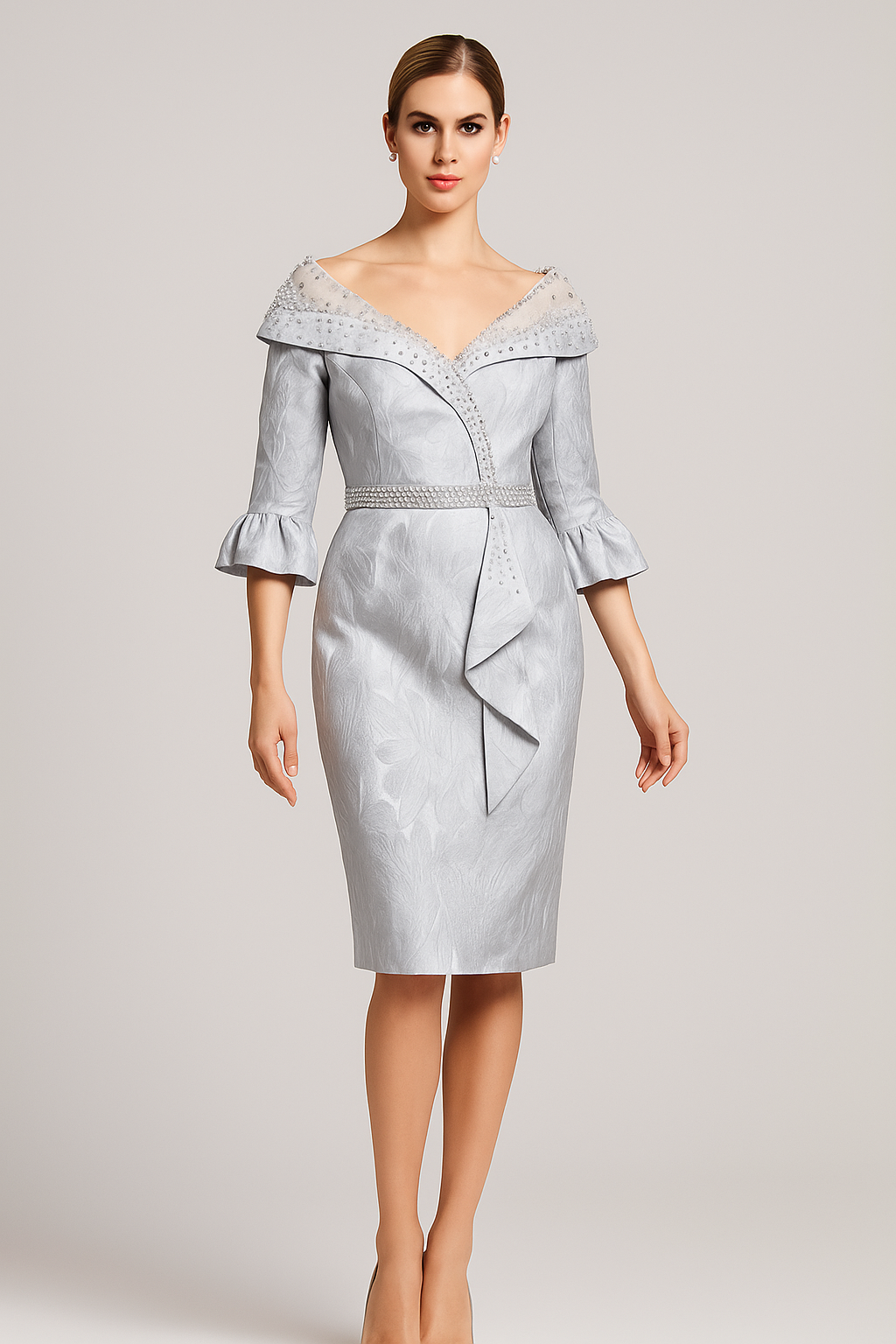 Vestido midi de corte entallado con escote bardot adornado con pedrería.