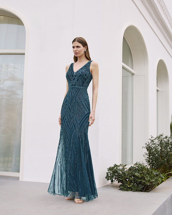 Vestido de fiesta largo, dos piezas confeccionado en pedrería.