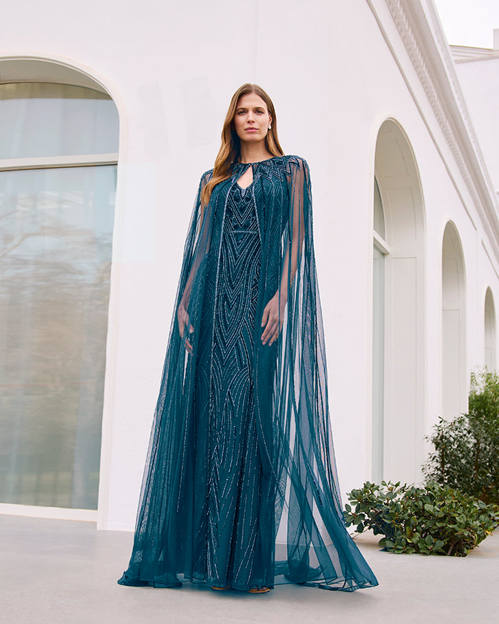 Con escote en V, tirantes, espalda en V y capa.