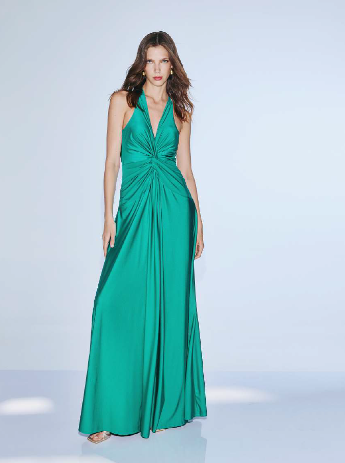 Vestido largo de fiesta con drapeado en la cintura.