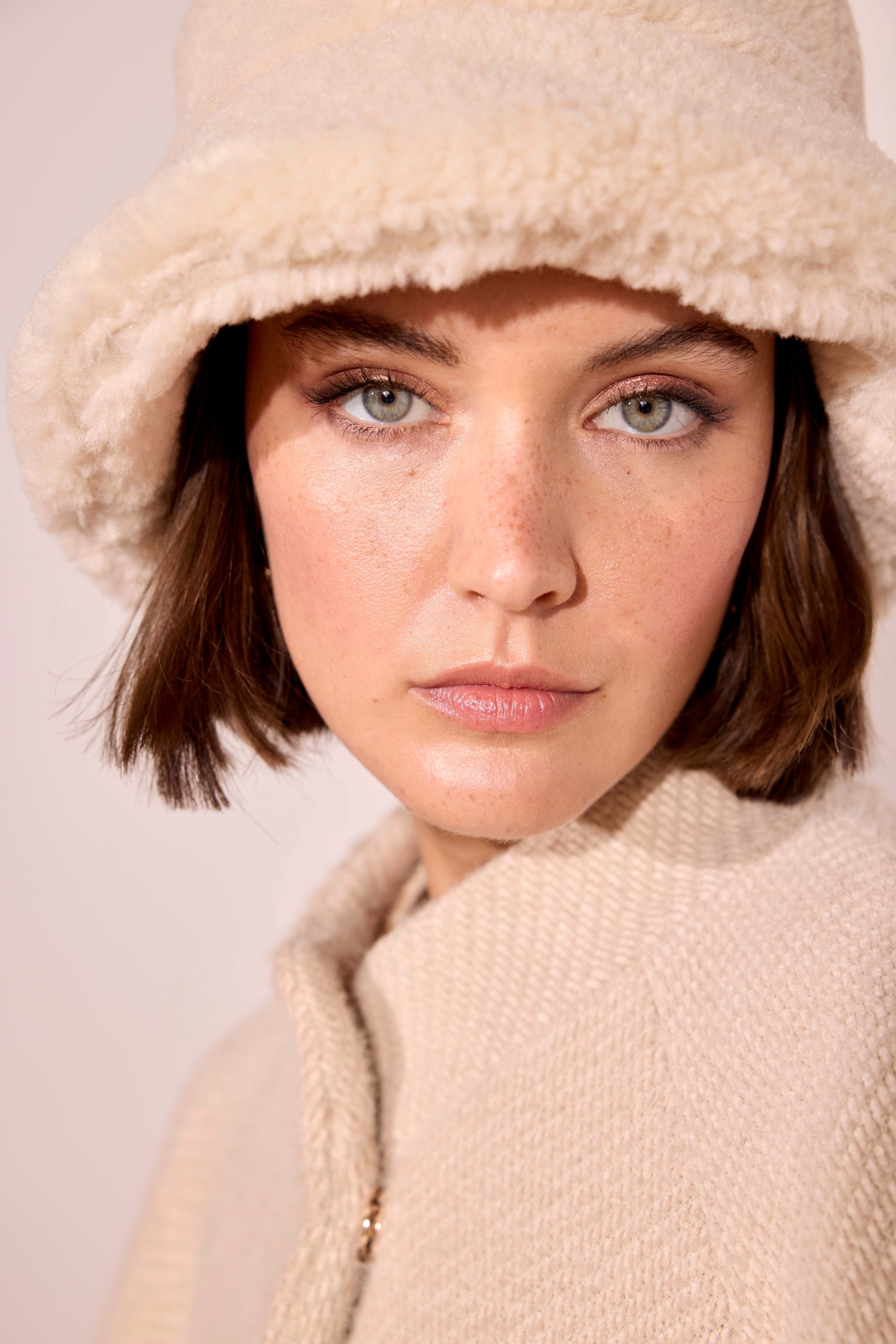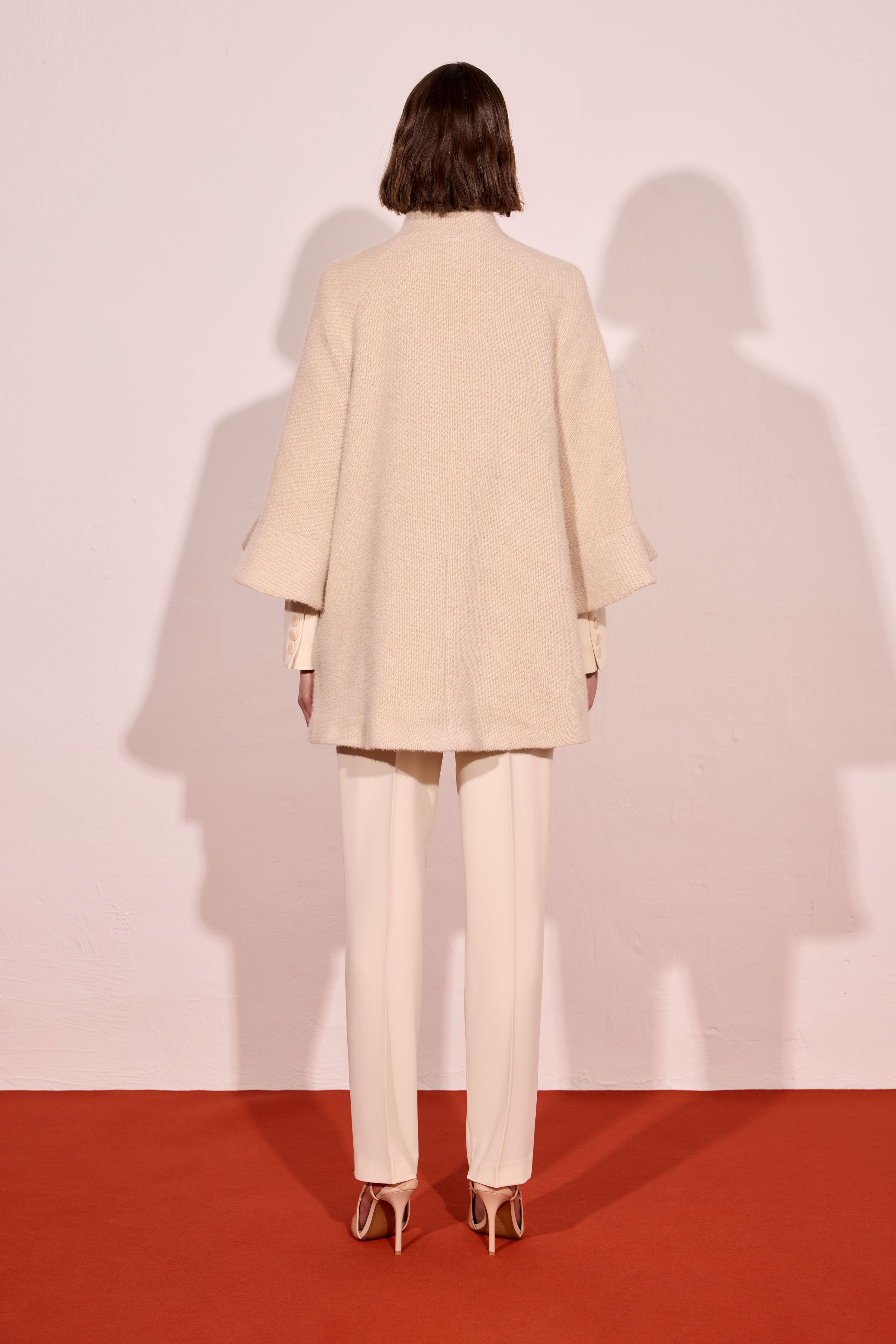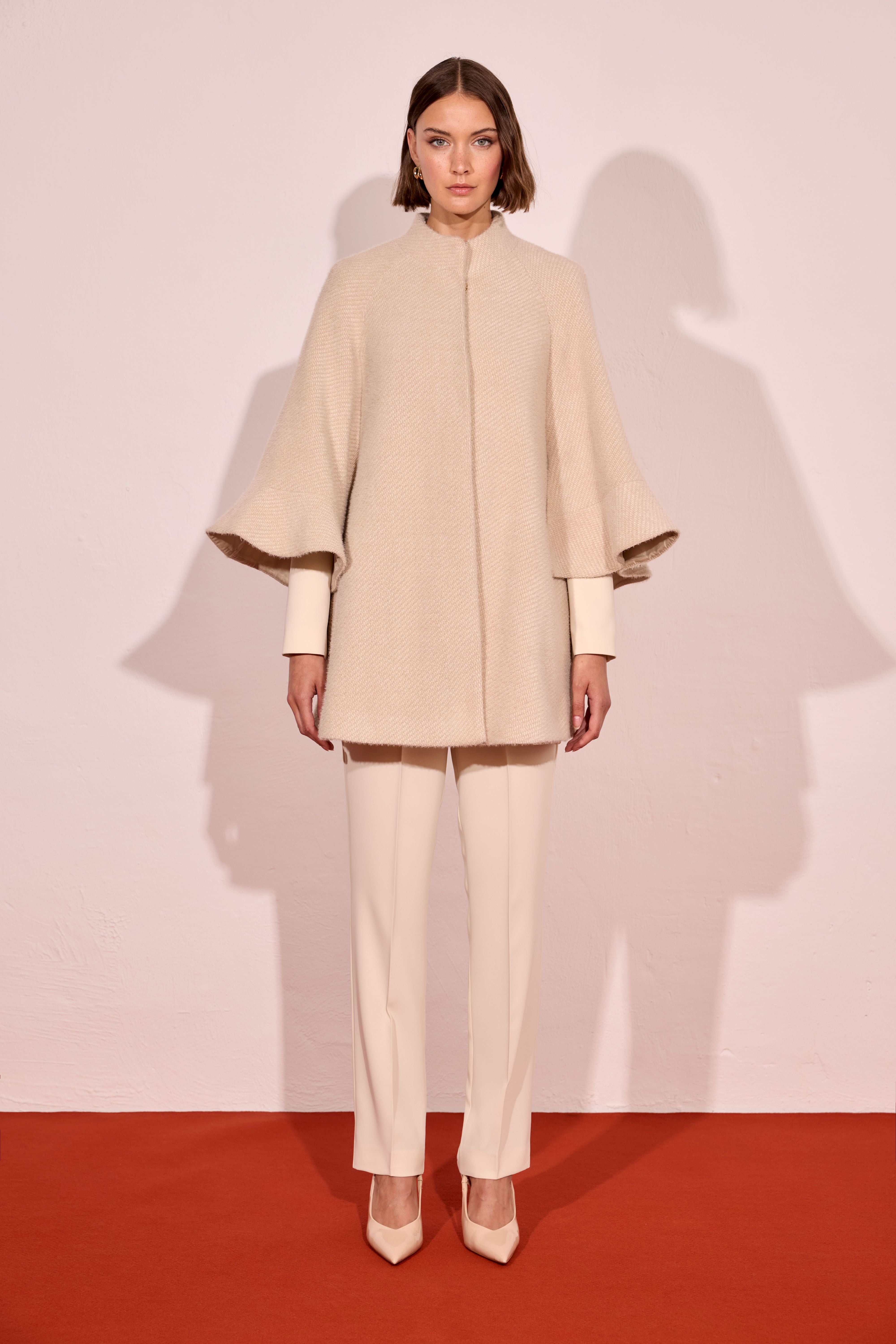 Capa confeccionada en un suave tejido de lana en color crudo. Con cuello alzado y mangas amplias de corte acampanado que aportan movimiento y fluidez a la prenda. Silueta suelta y envolvente, perfecta para superponer sobre looks formales o casuales, elevando cualquier conjunto.