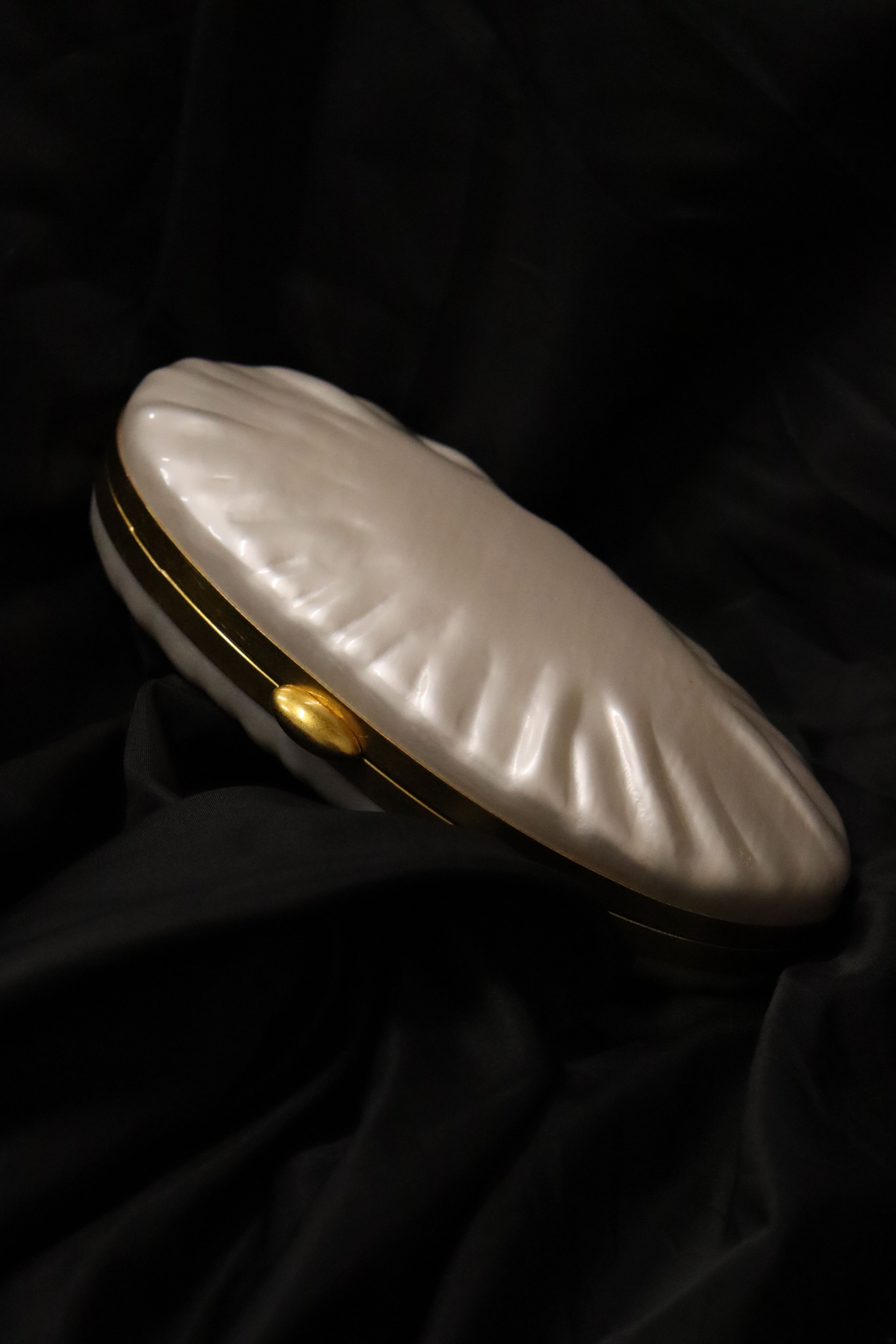 Cartera de fiesta rígida con acabado nacarado que recuerda a una concha marina.