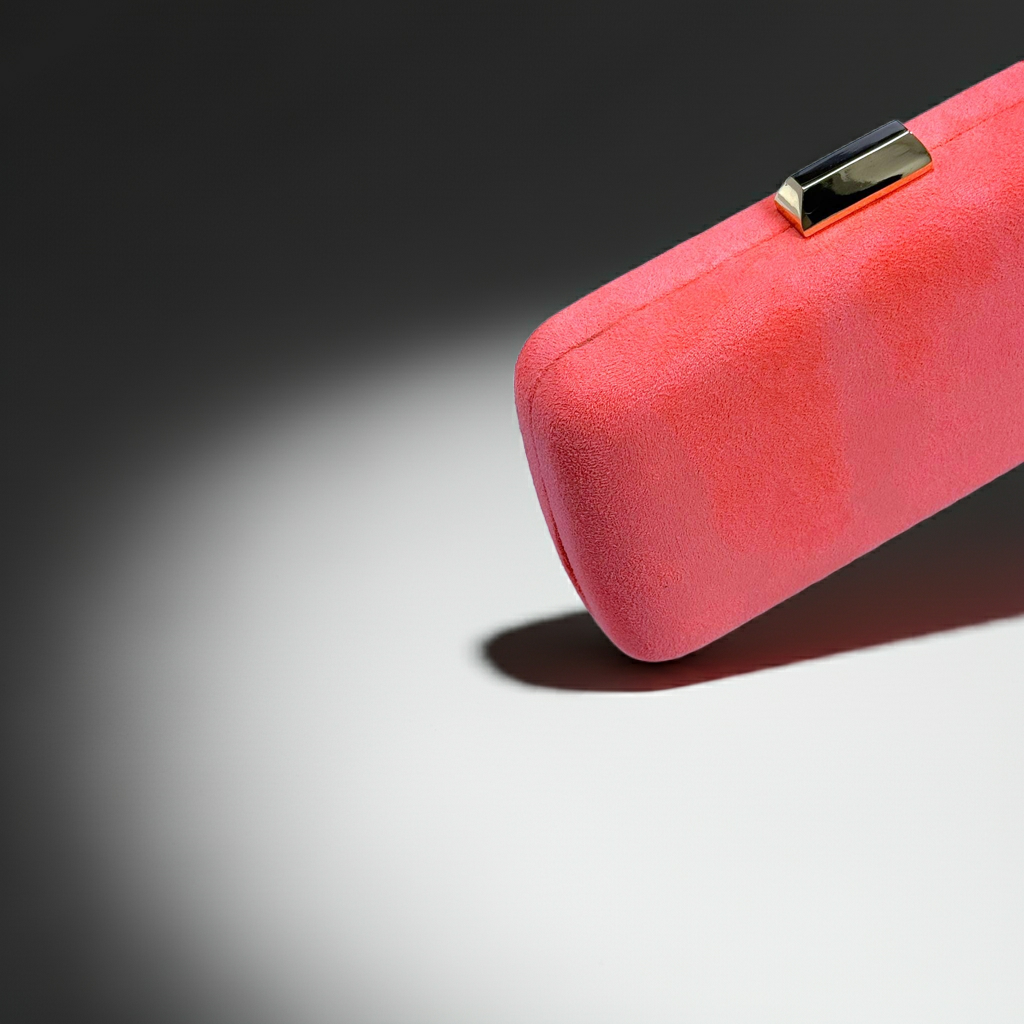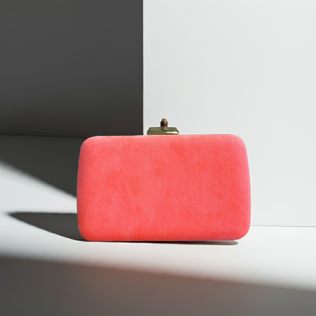 Clutch de fiesta de antelina con esquinas redondeadas.