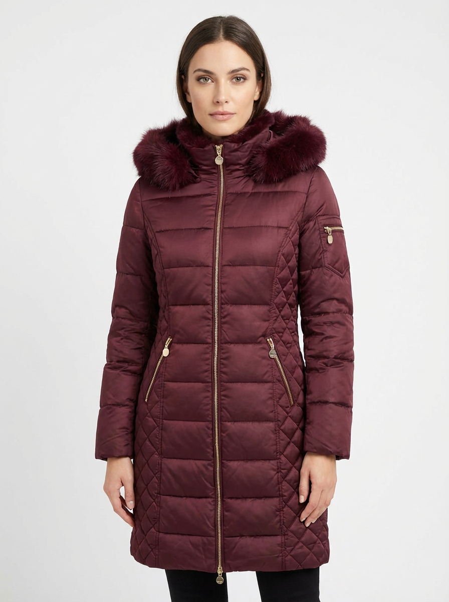 Parka acolchada entallada con costuras horizontales y detalles laterales en patrón rombo.