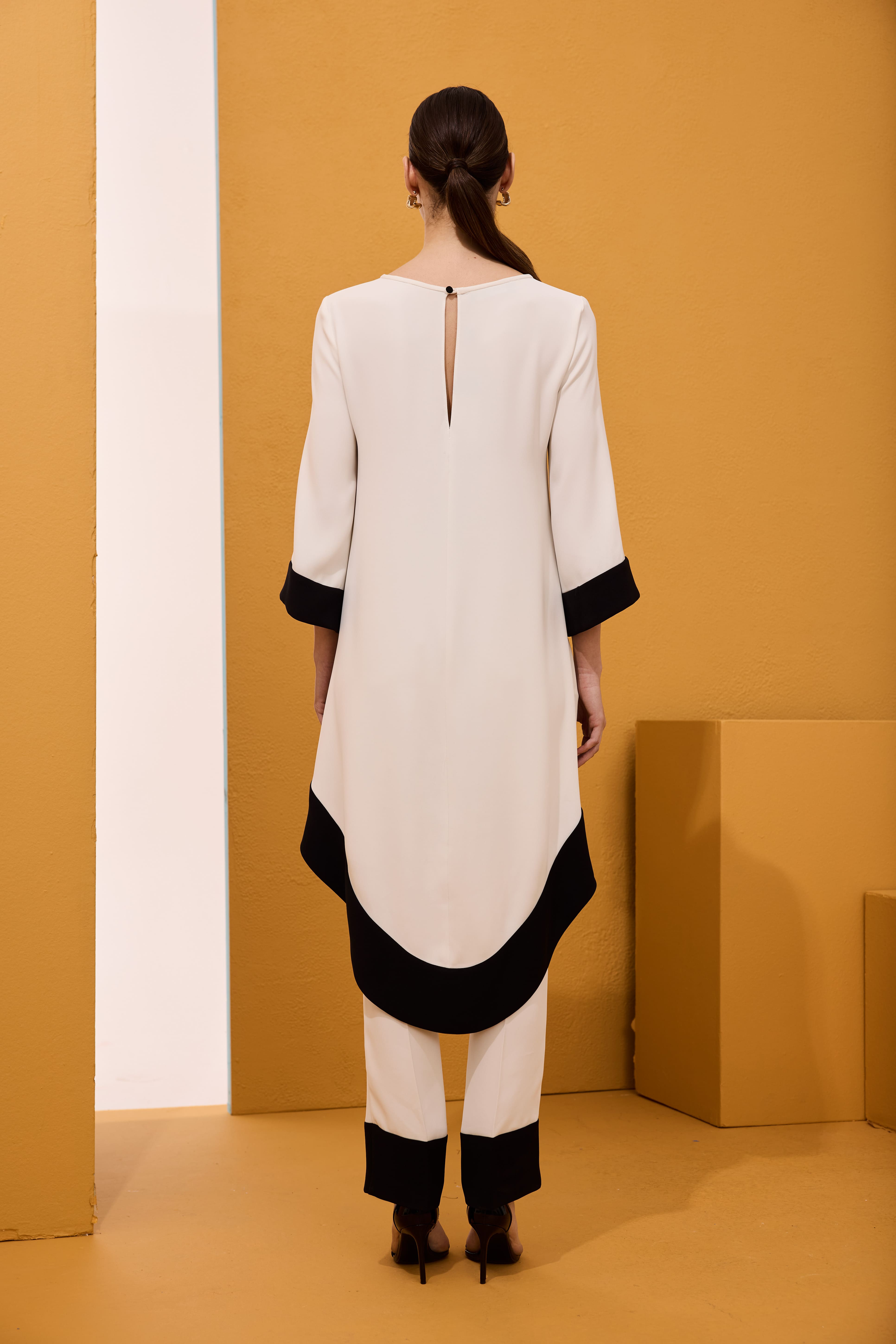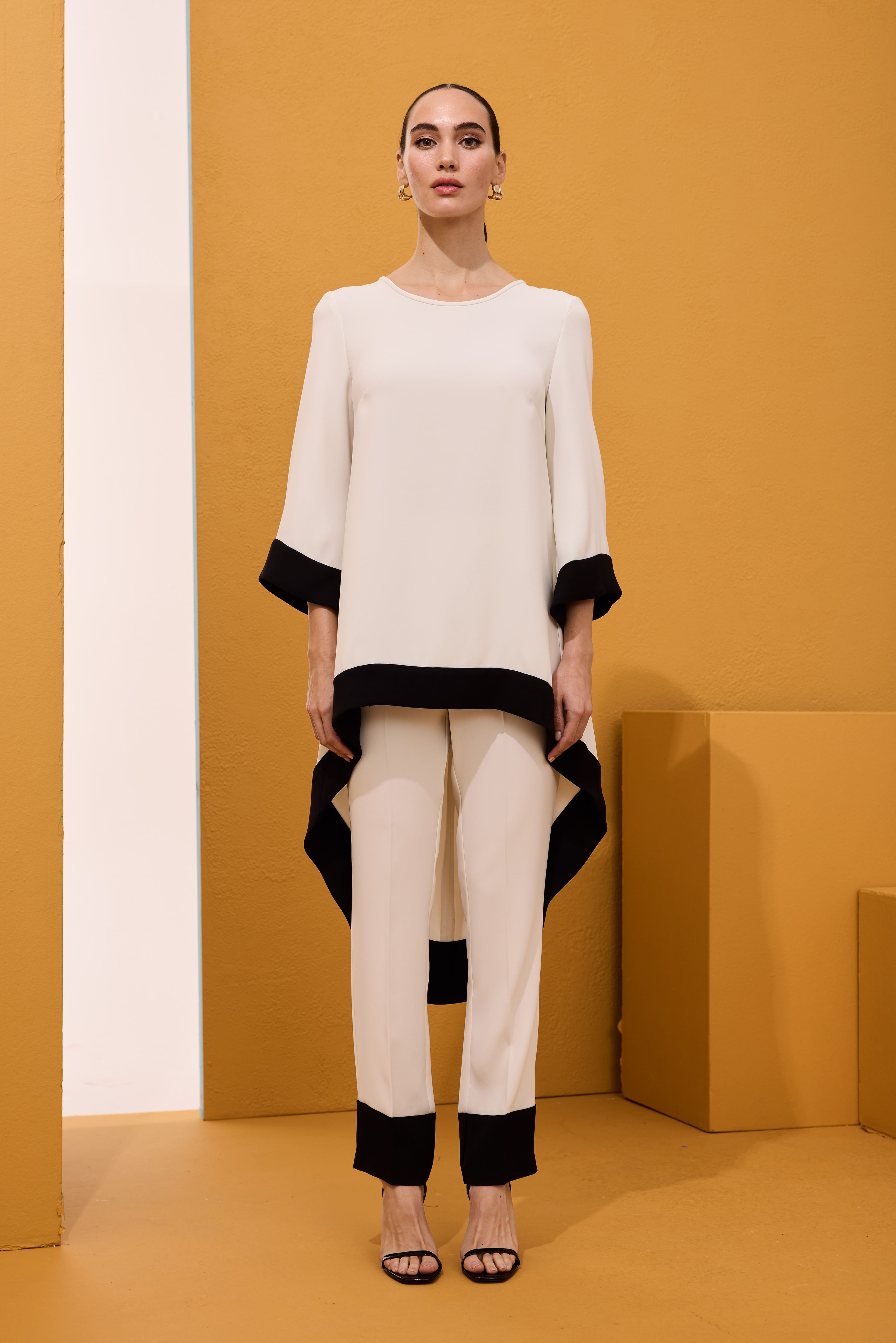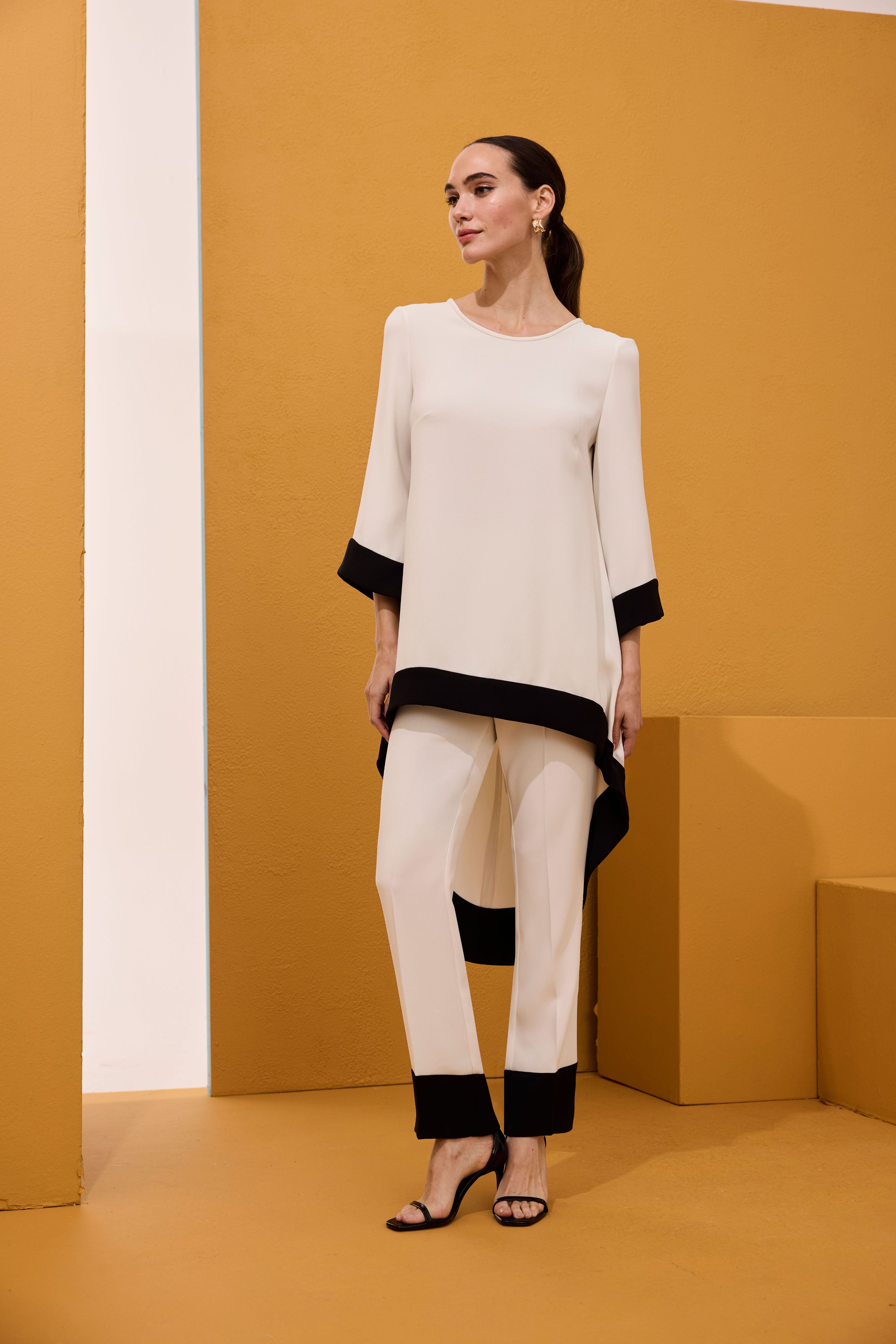 Conjunto de dos piezas compuesto por blusa fluida de manga amplia y bajo asimétrico más largo en la parte trasera.