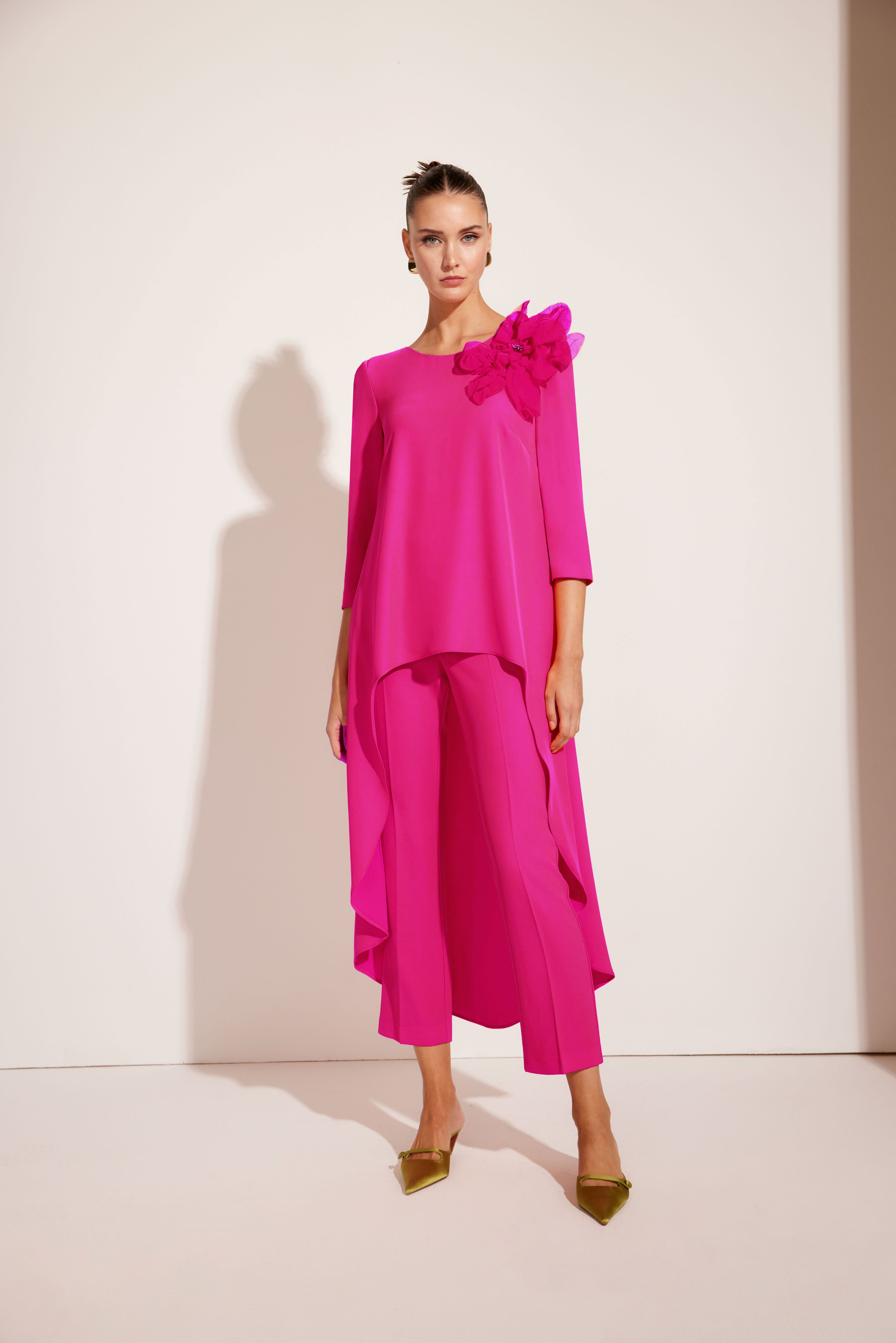 Conjunto de Carla Ruiz de dos piezas. Cuerpo tipo casaca con manga 3/4, cuello barco y bajos asimétricos. Pantalón recto con tiro alto.