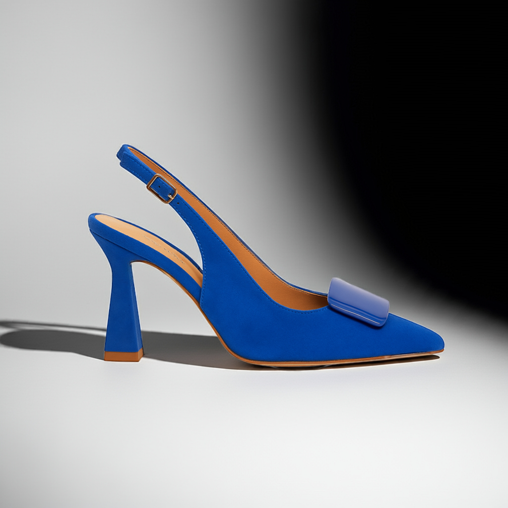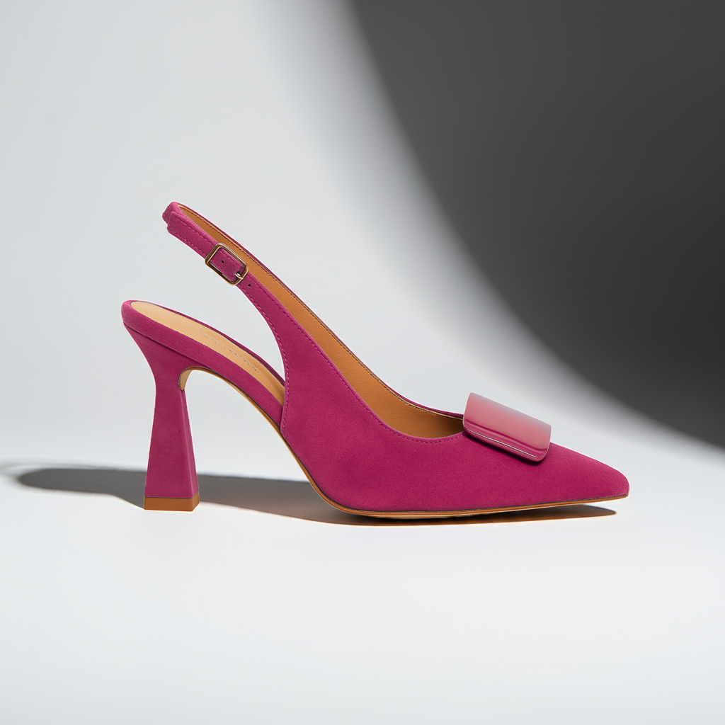 Tacón de ante Toni Fernández, punte stiletto y tacón acampanado invertido. Con detalle decorativo en la parte superior del empeine. Parte del talón abierta con correa ajustable.