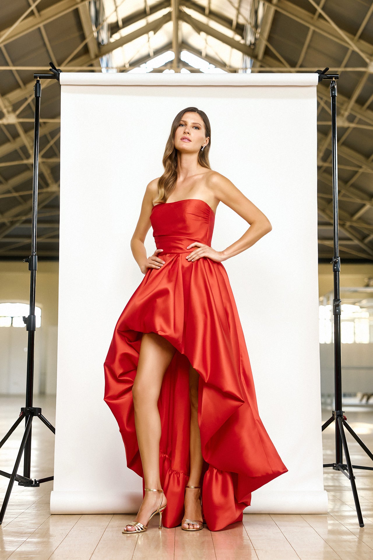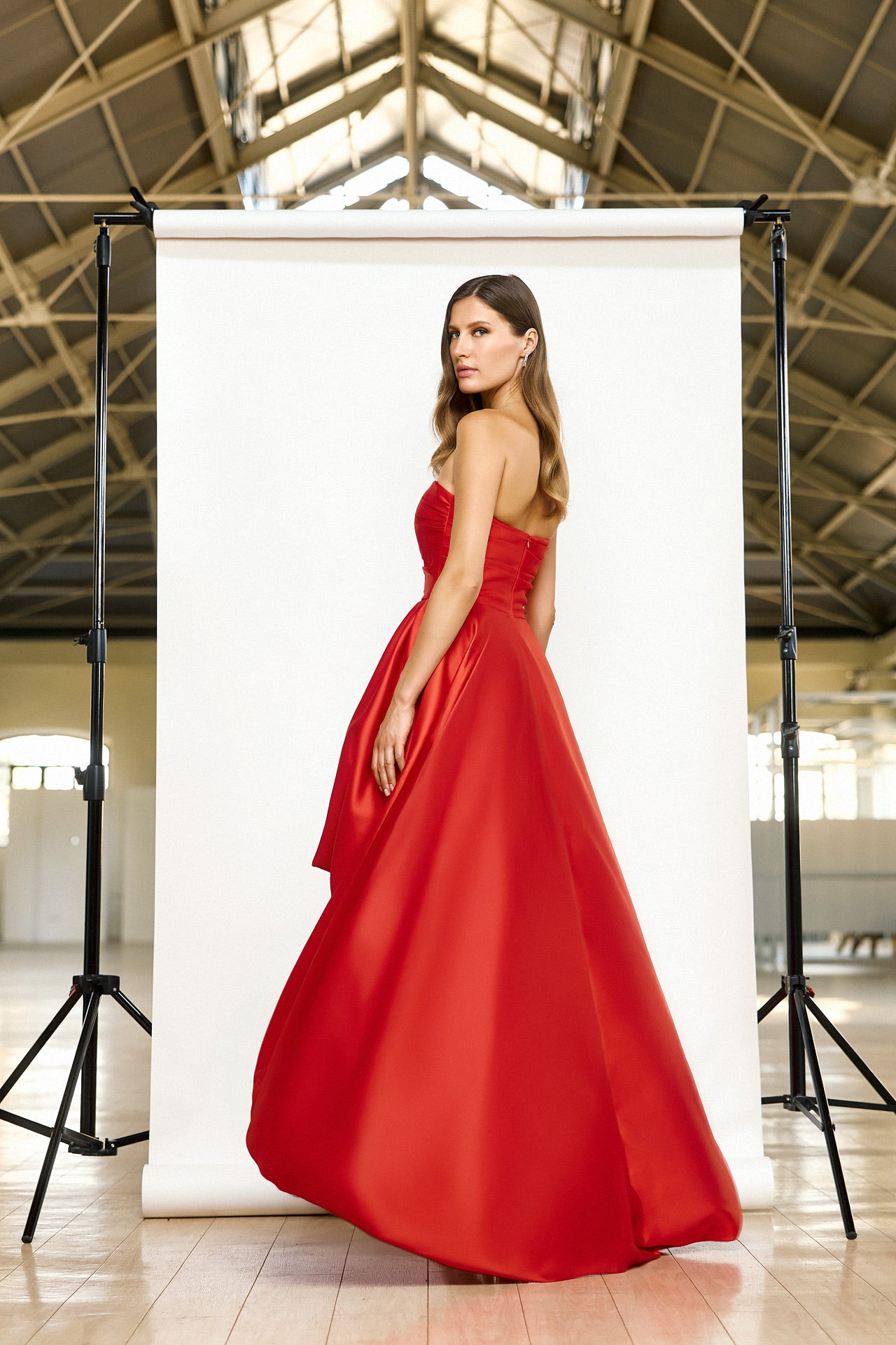 Vestido largo de fiesta confeccionado en raso de color rojo.