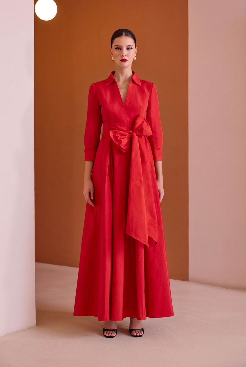 Vestido largo estilo camisero confeccionado en tafetán.