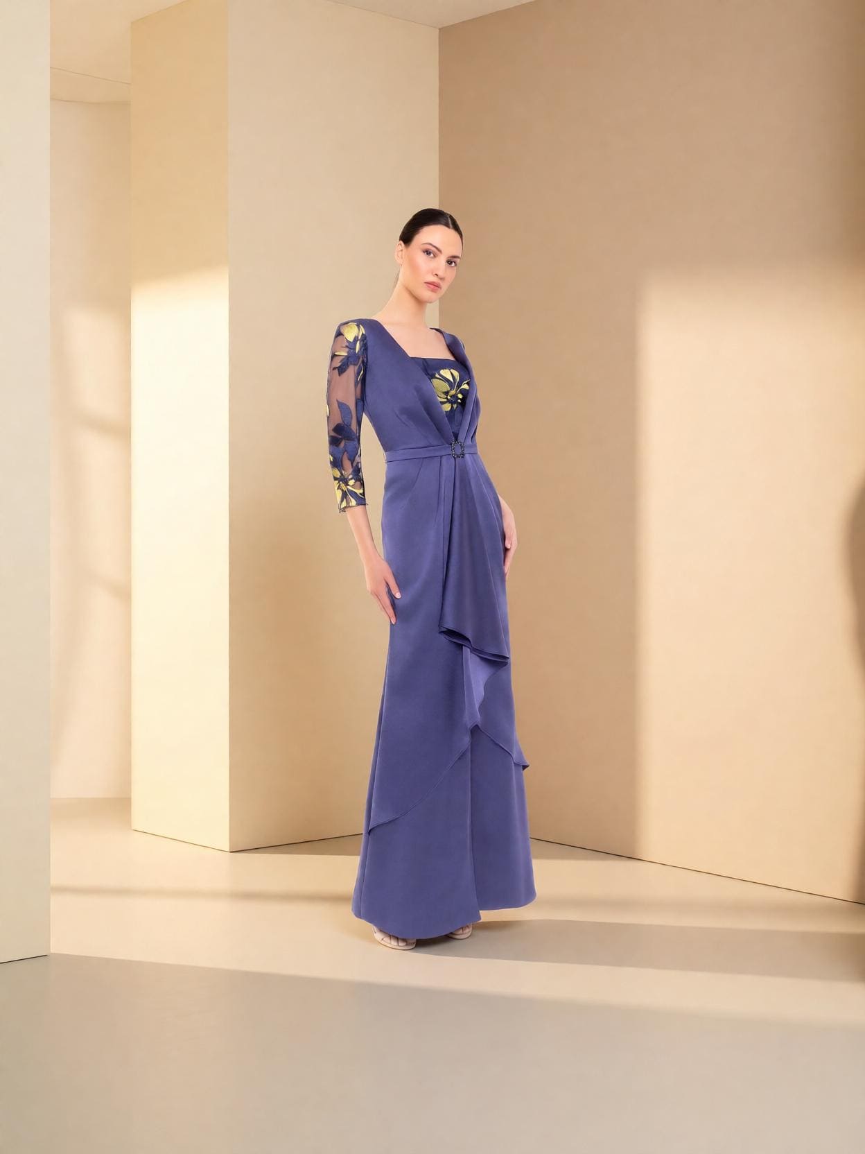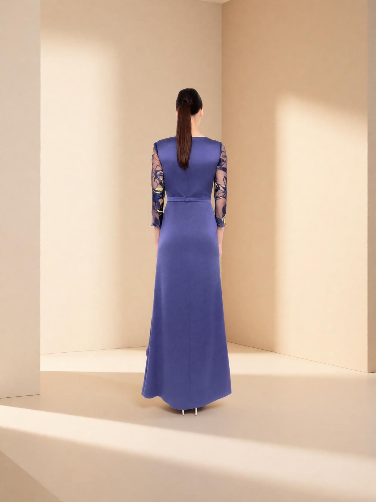 Vestido largo de fiesta confeccionado en crepe con encaje.