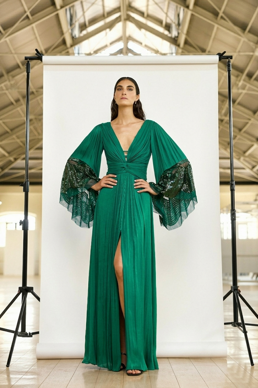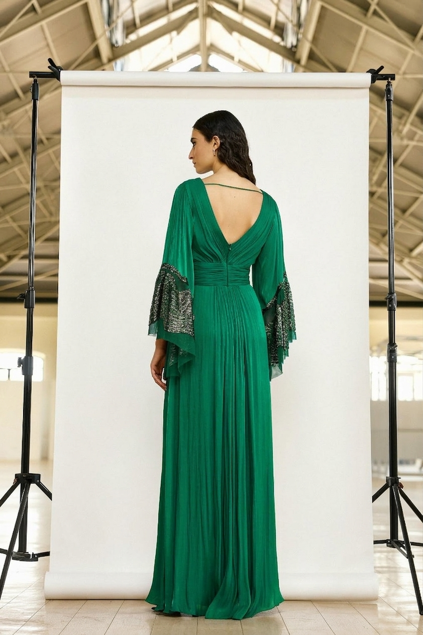 Long sleeves made of pleated fabric with tulle fringes and rhinestones.