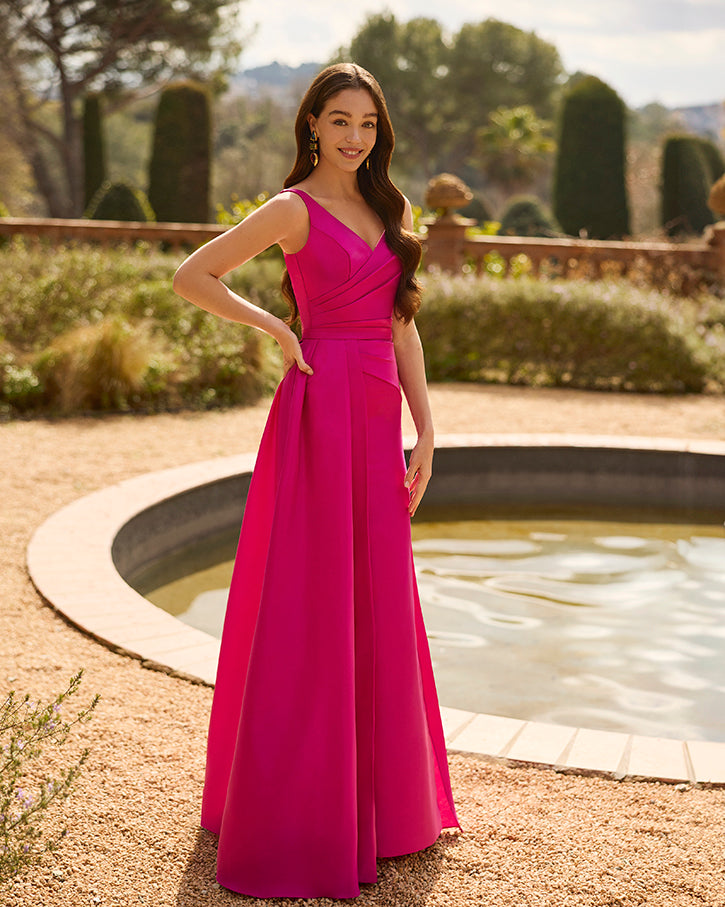 Long party dress made from satin mikado.