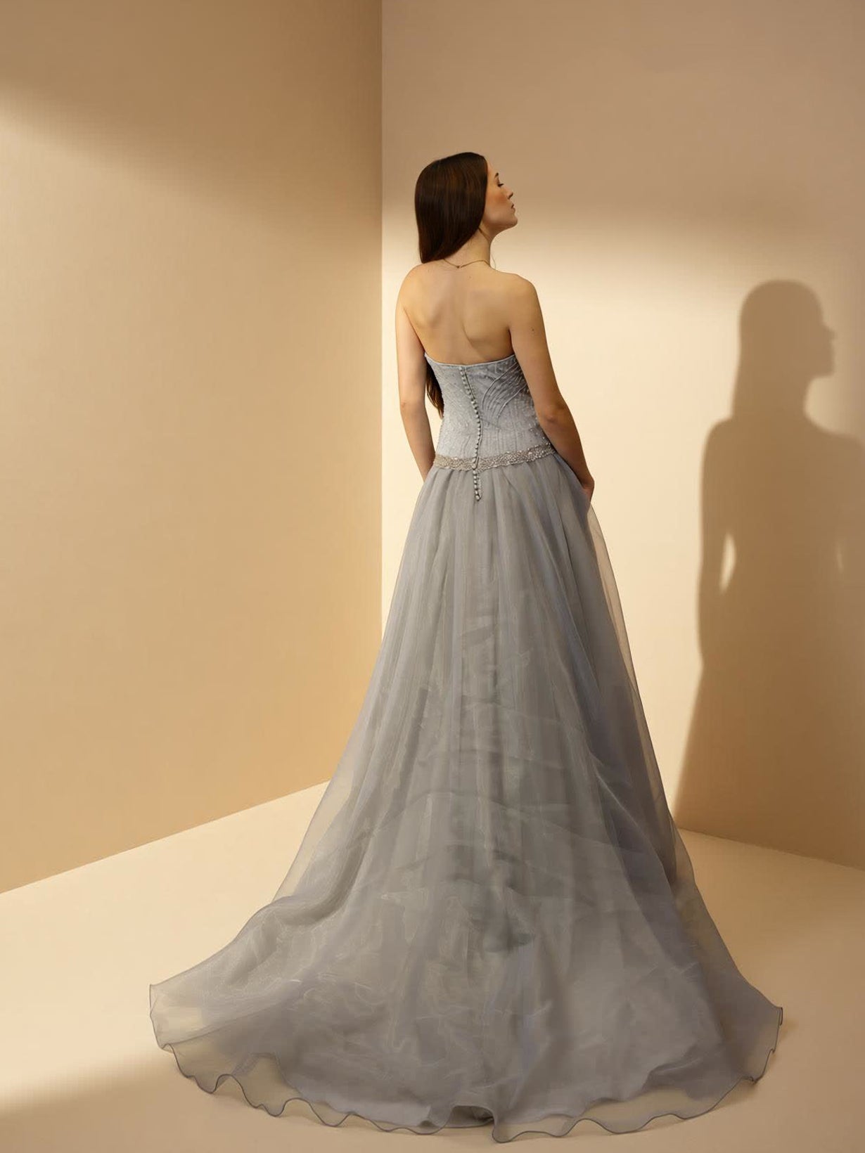 Vestido largo de fiesta con cuerpo tipo corsé estructurado y detalles de pedrería.
