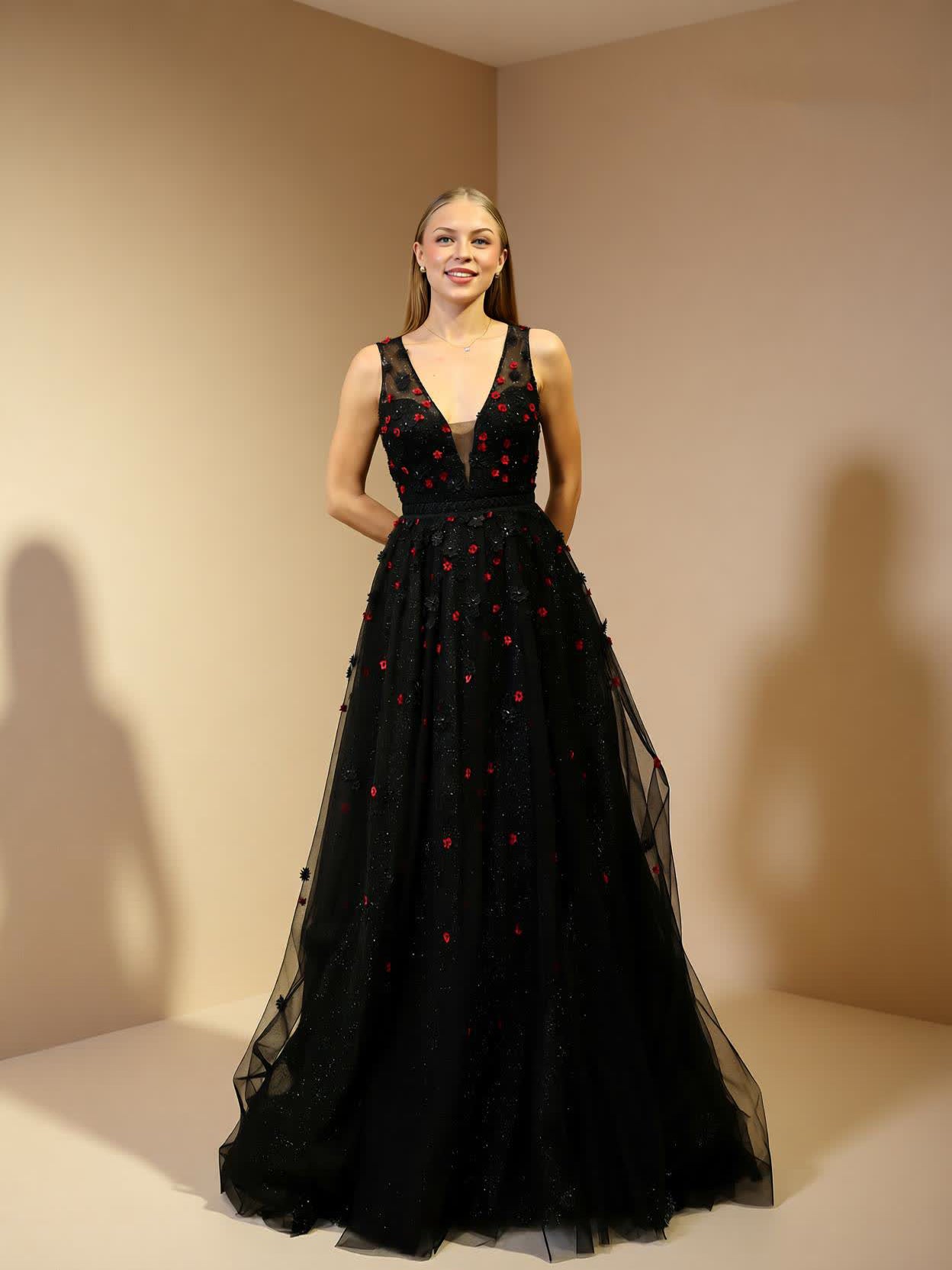 Vestido largo de fiesta confeccionado en tul condetalles de pedrería.