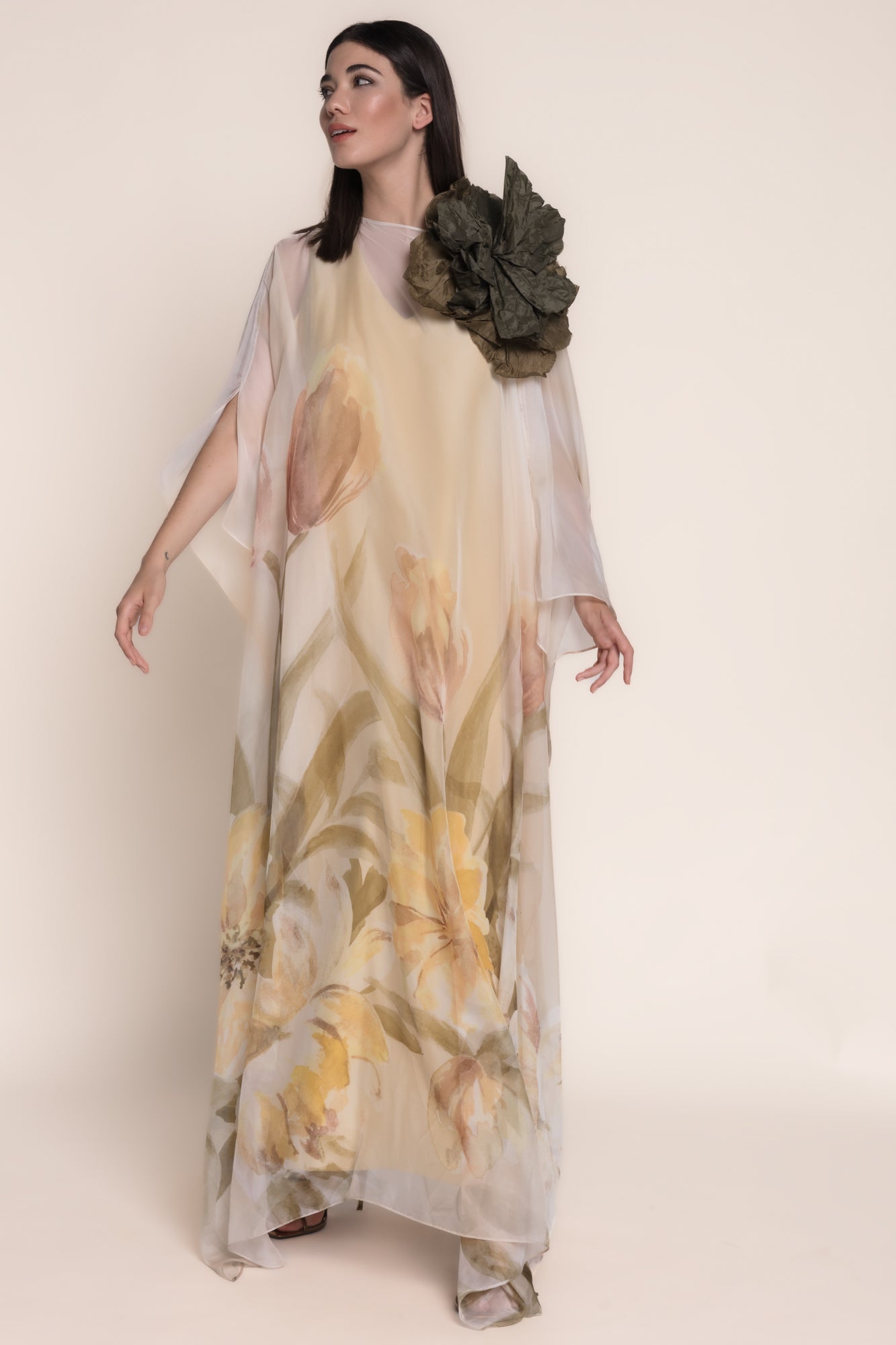 Vestido largo de fiesta confeccionado en tejido vaporoso semitransparente con estampación floral en tonos suaves.