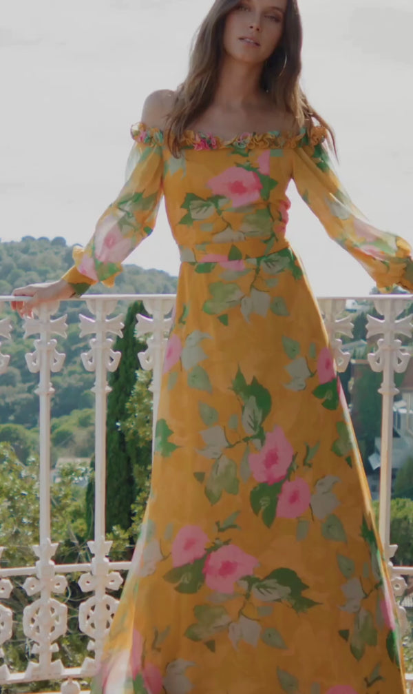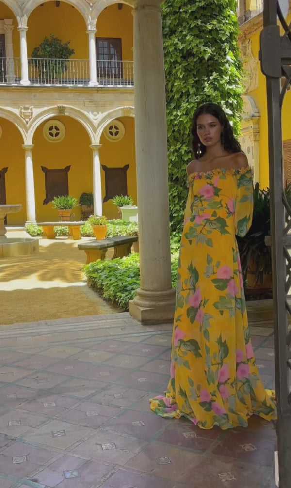 Vestido largo estampado floral en tonos amarillos y rosas.