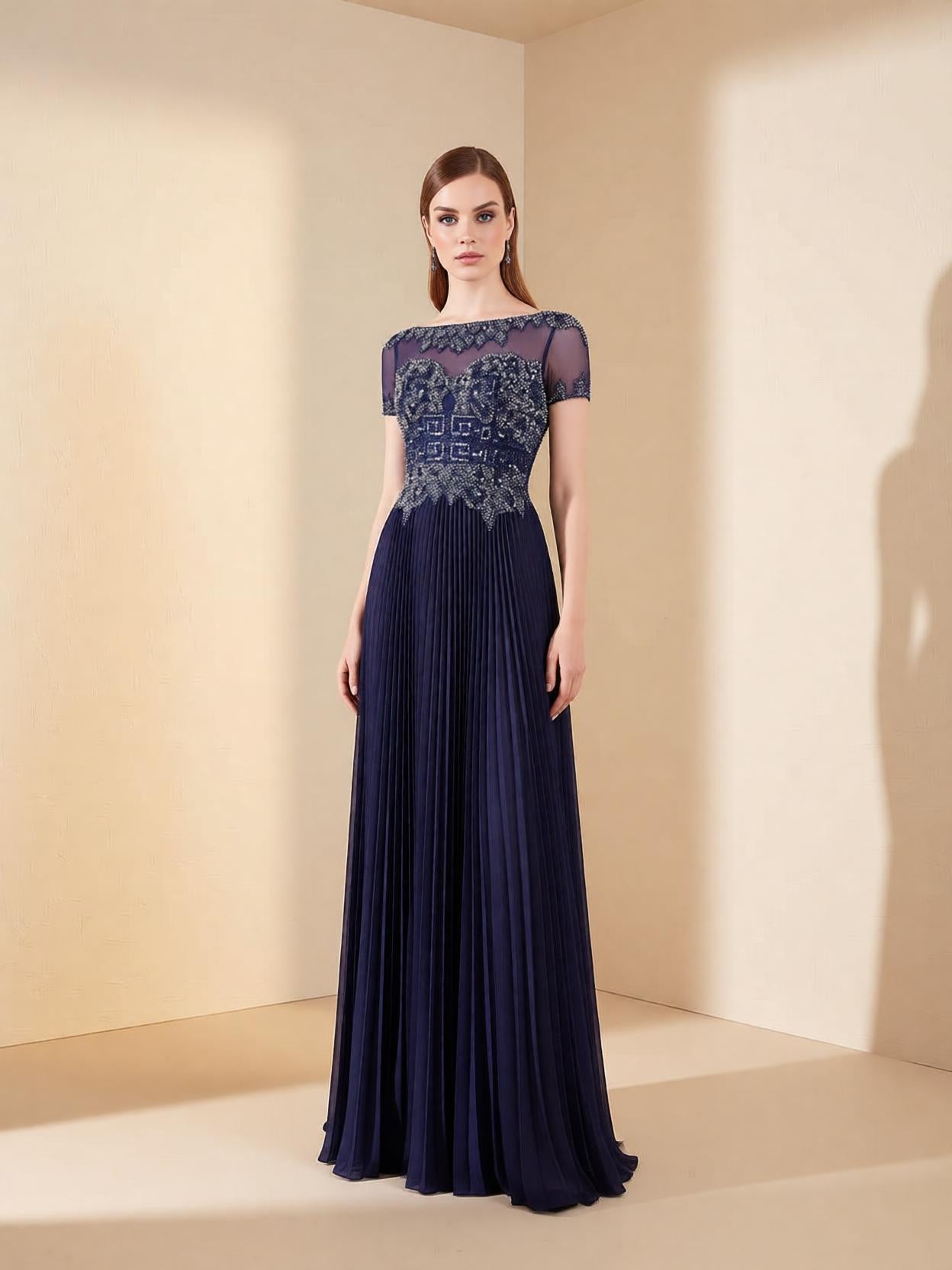 Vestido largo de fiesta con cuerpo ajustado y escote ilusión en tul con bordado de pedrería. Mangas cortas y de tul, que aportan ligereza al conjunto.