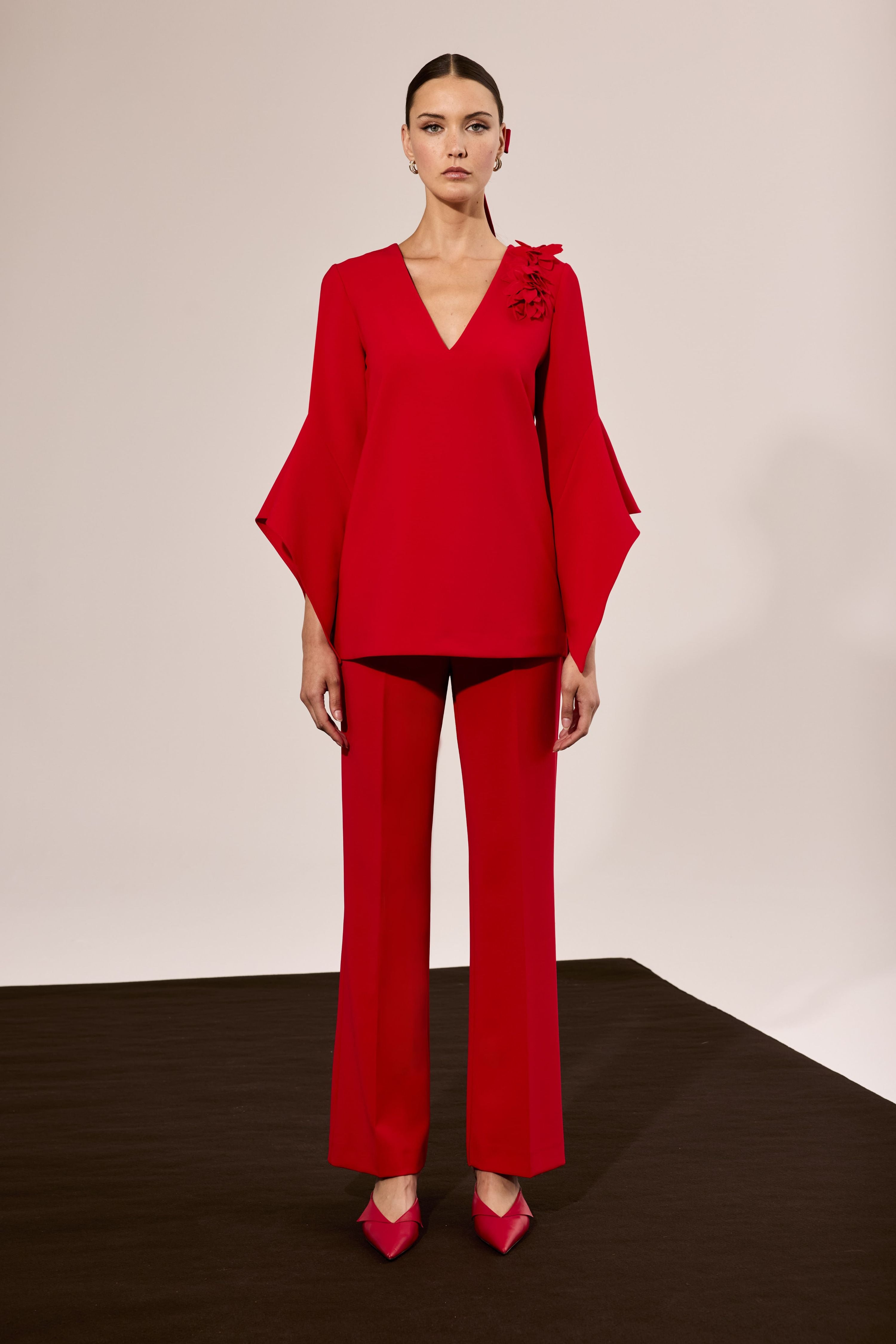 Conjunto rojo con blusa de escote en V y detalle de aplique floral.
