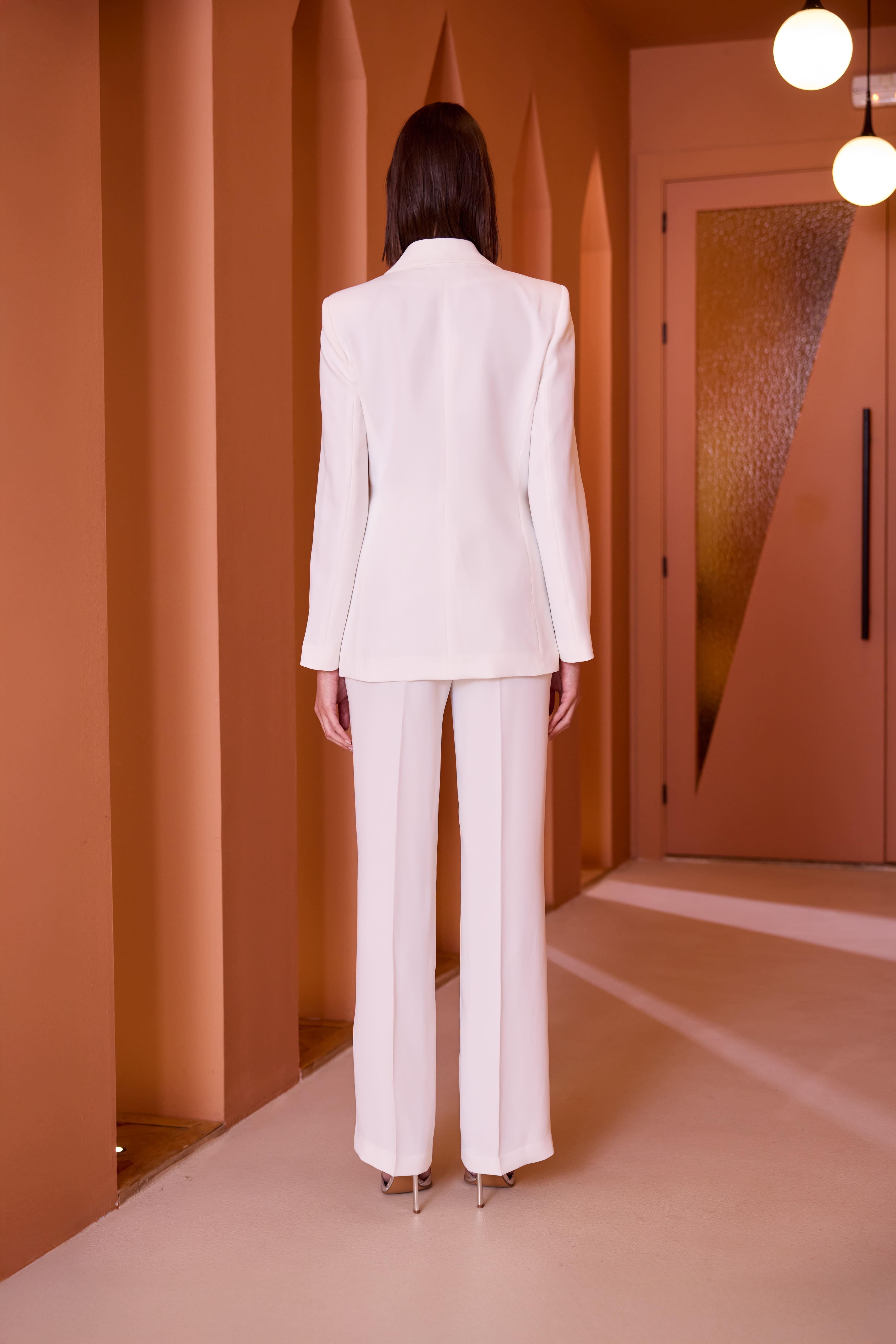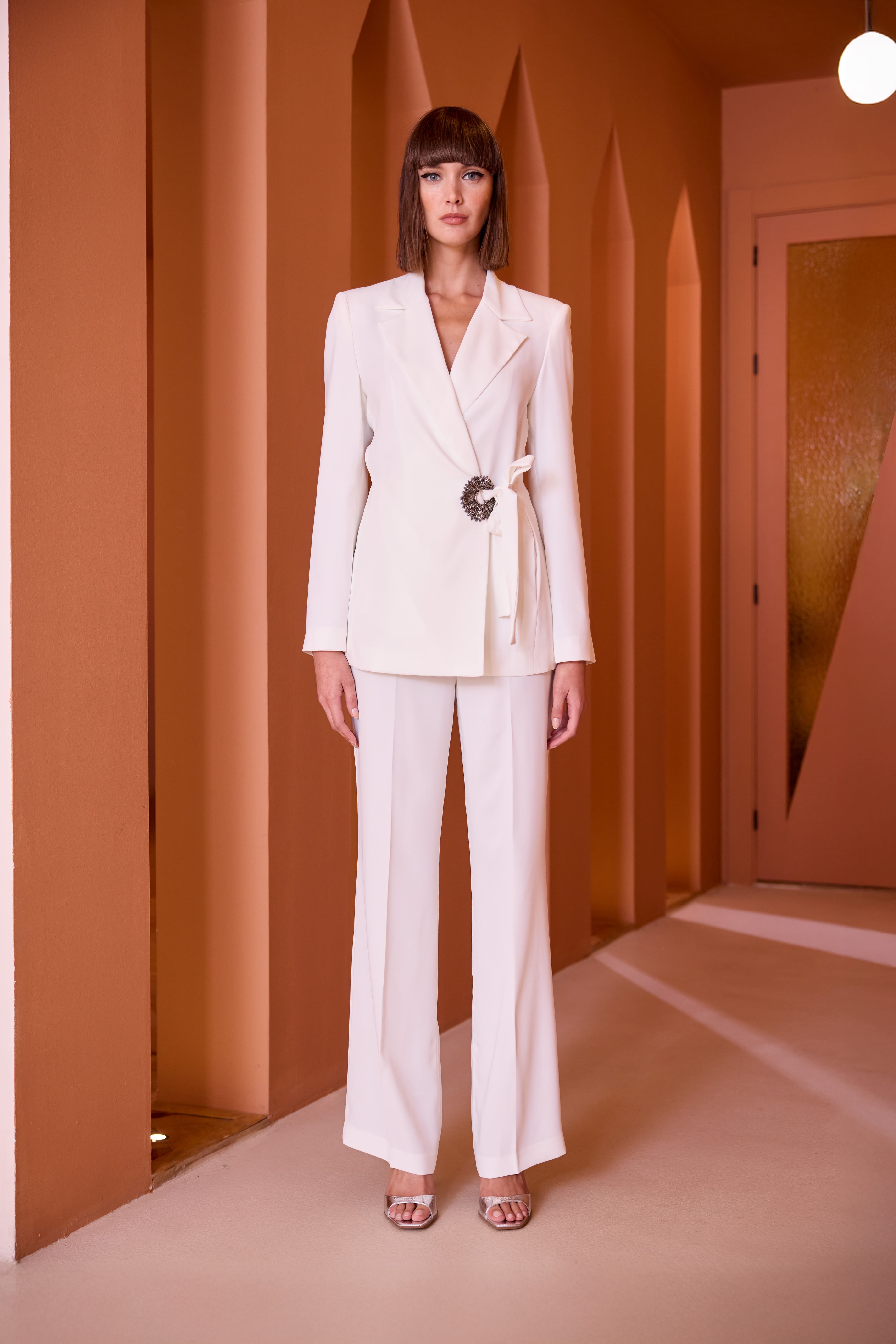 Blazer cruzada de estructura entallada y solapas de pico. Cuenta con un broche circular de pedrería en el lateral.