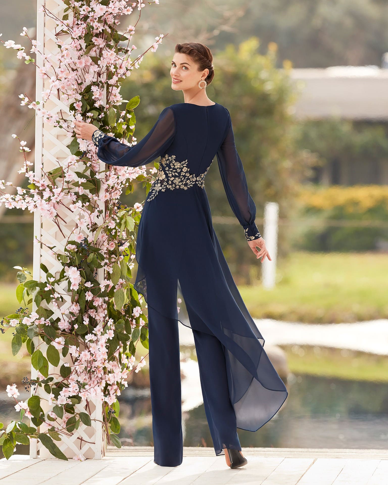 Mono de fiesta confeccionado en georgette con detalles bordados en la cintura y puños.