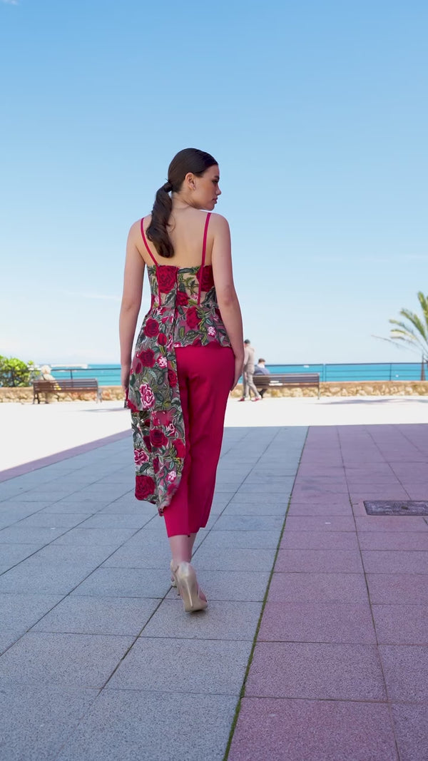 Top bordado de rosas de de Manila. Escote corazón, peplum y tirantes finos en color rojo.