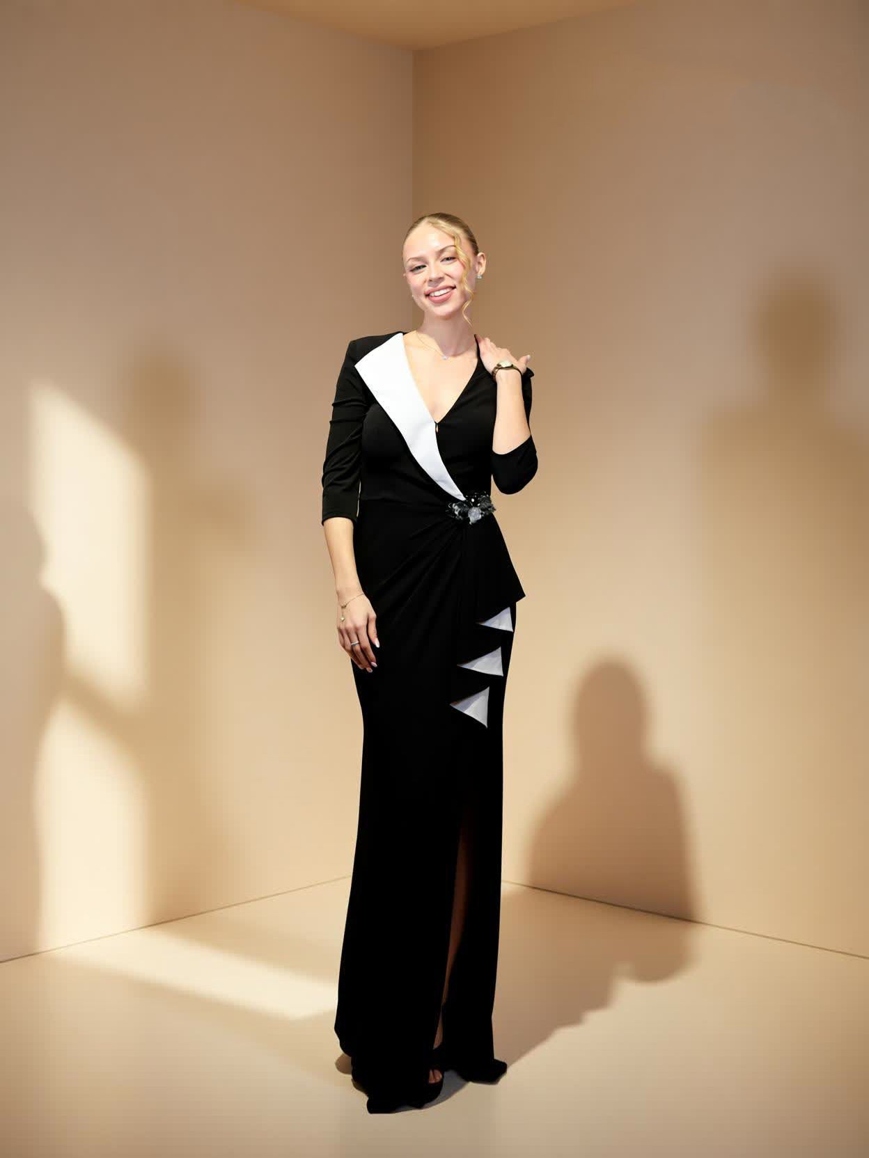 Escote cruzado con solapa en color blanco que cae en cascada por la falda.