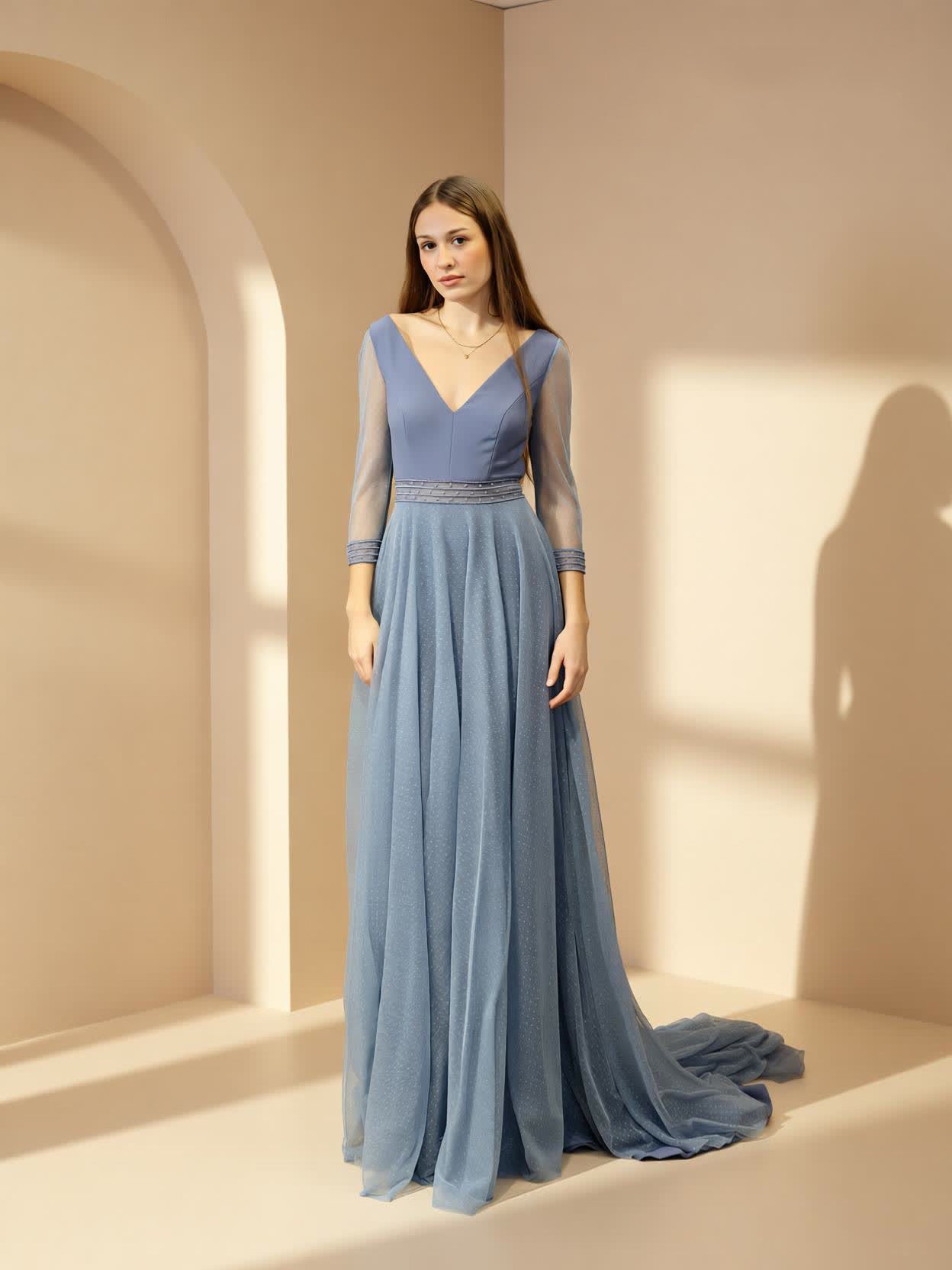 Vestido largo de fiesta confeccionado en tul con topitos.