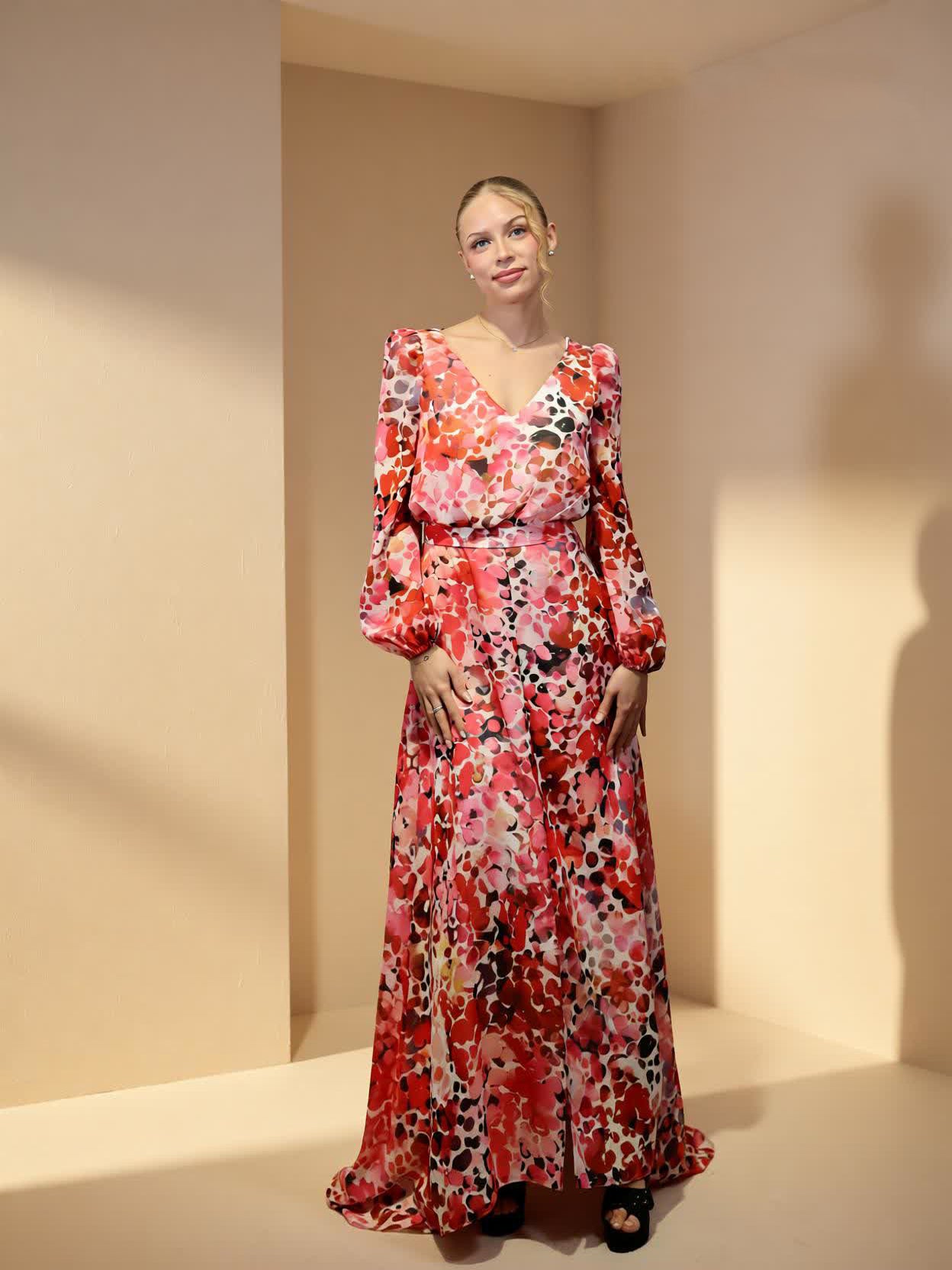 Vestido largo de fiesta confeccionado en gasa estampada.
