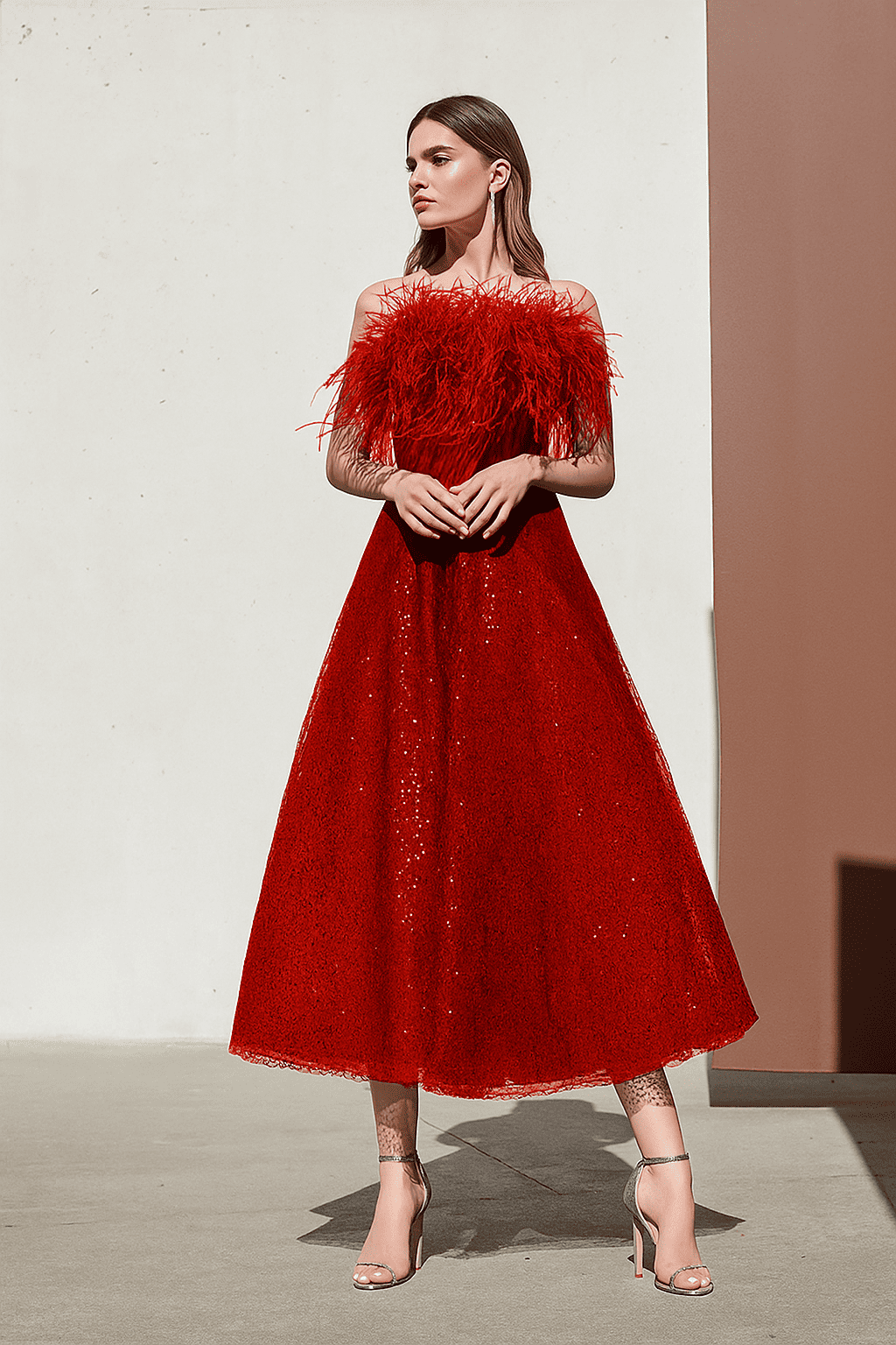 Confeccionado en tul combinado con pedrería, espalda cerrada, tirantes extraíbles, escote palabra de honor con plumas.
