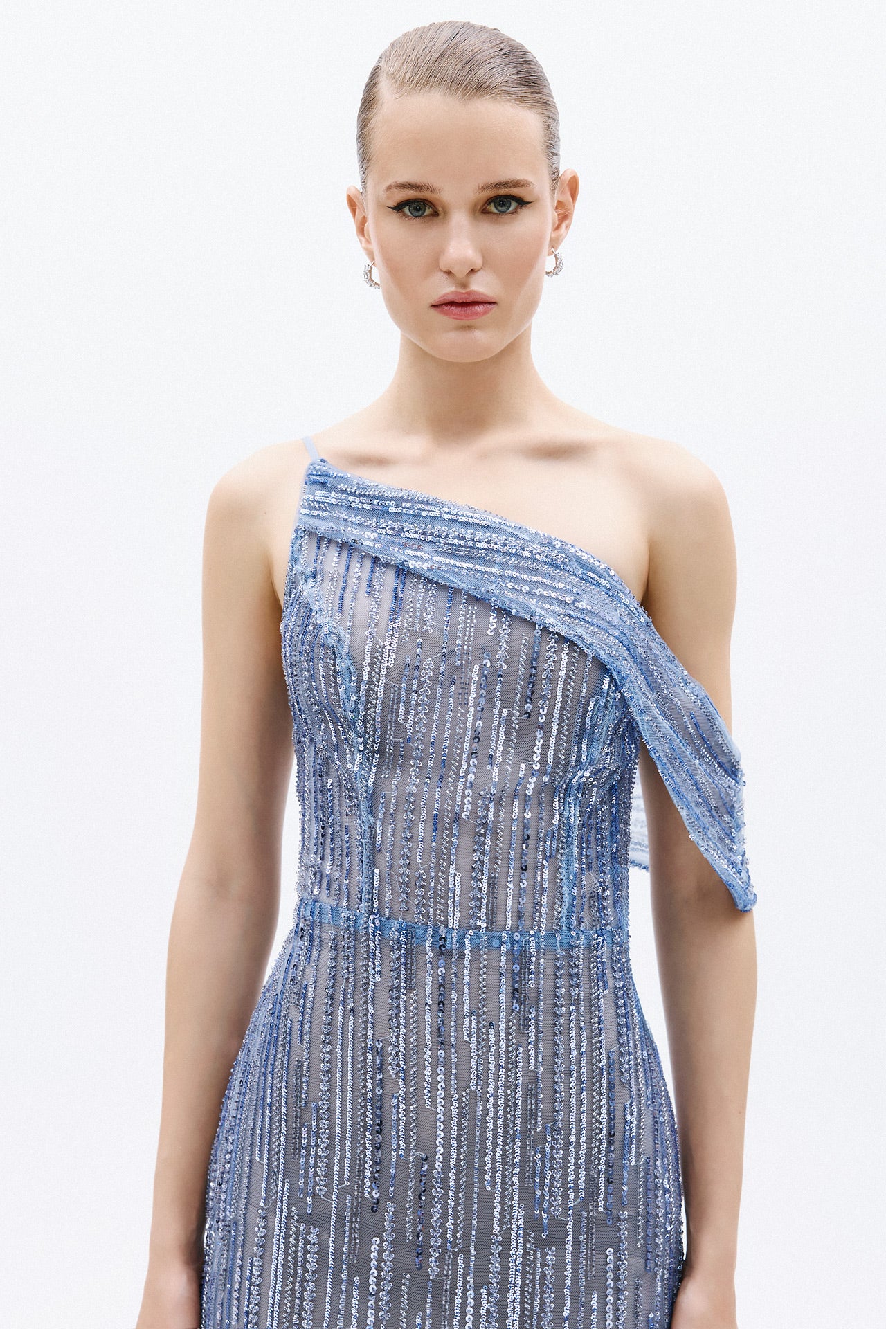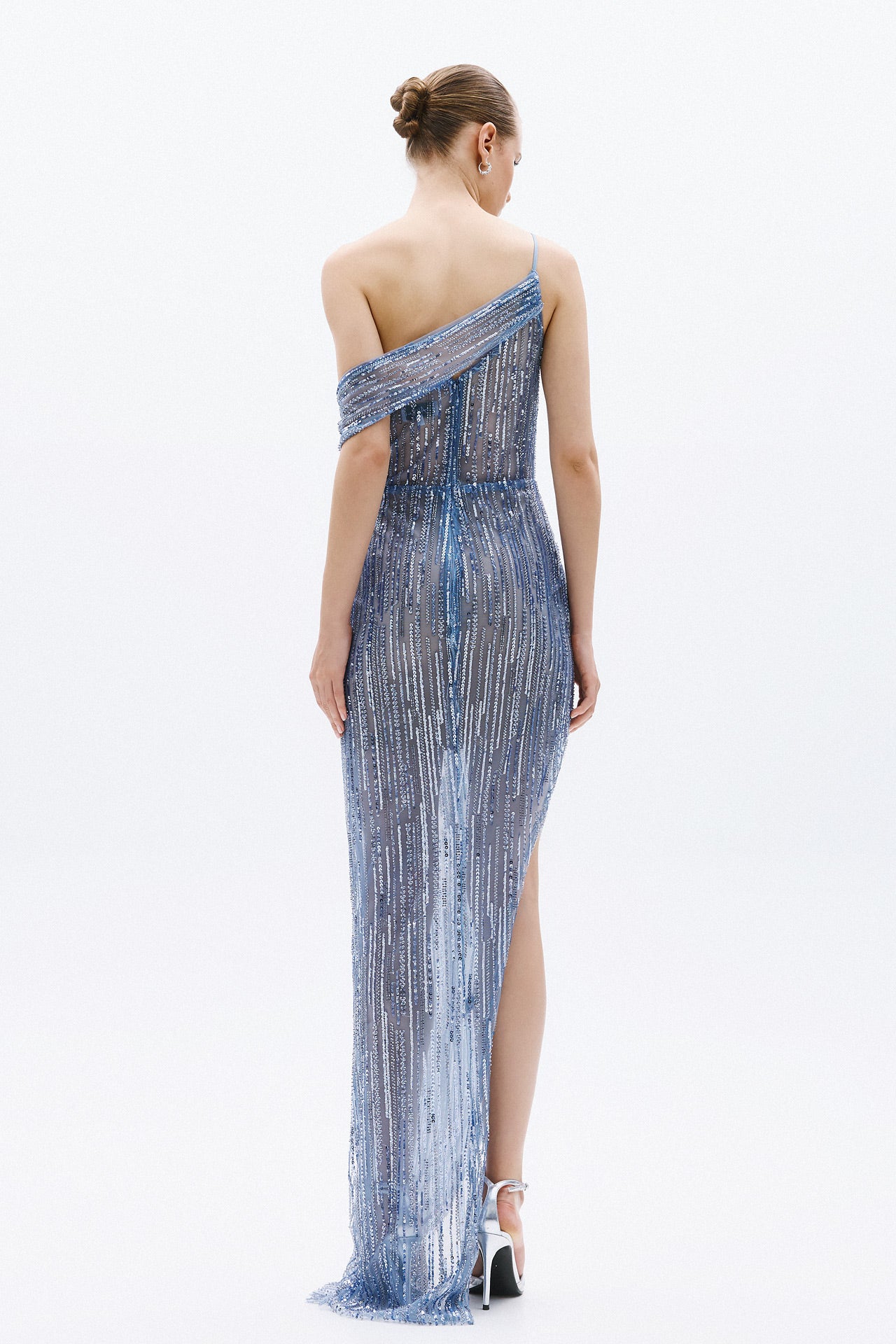 Vestidos largo de pedrería con abertura lateral en la falda.