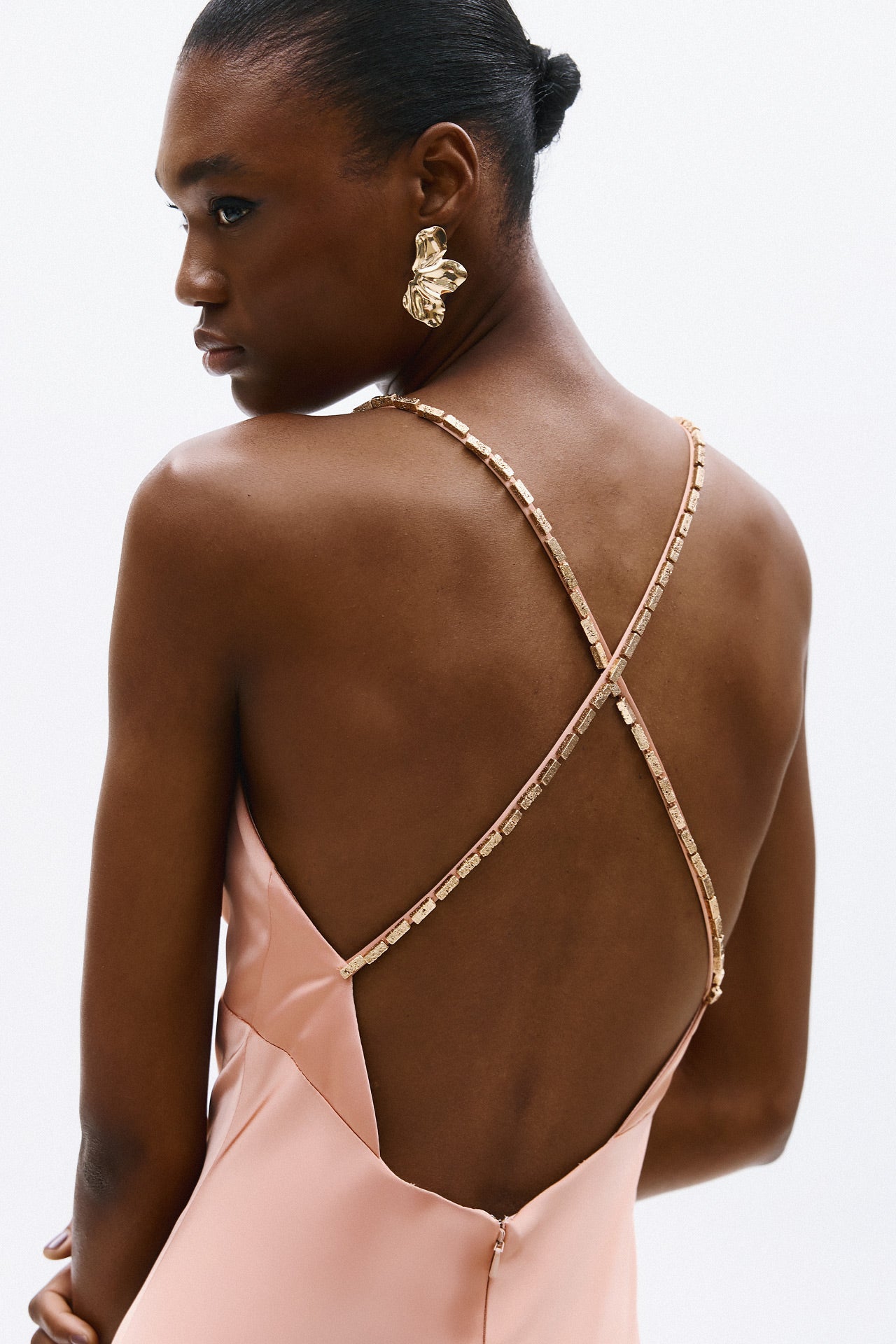 Escote pronunciado y espalda con tirantes finos cruzados.