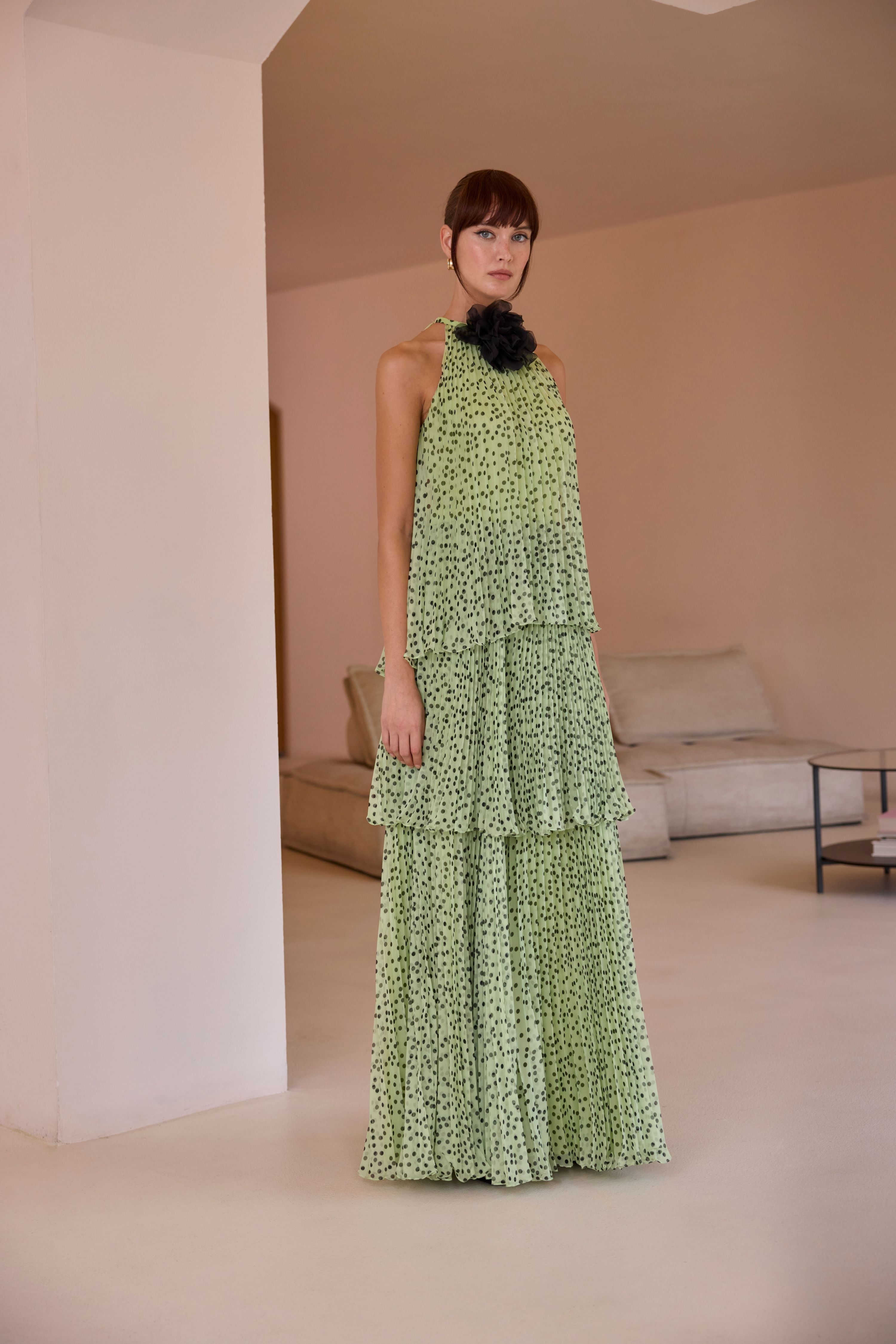 Vestido largo de silueta fluida confeccionado en tejido ligero plisado, con delicado estampado de lunares sobre fondo verde suave. Presenta escote halter que realza los hombros y un elegante detalle floral en el cuello que aporta un toque sofisticado y distintivo. Su diseño en capas crea movimiento y volumen, ofreciendo una caída femenina y favorecedora.