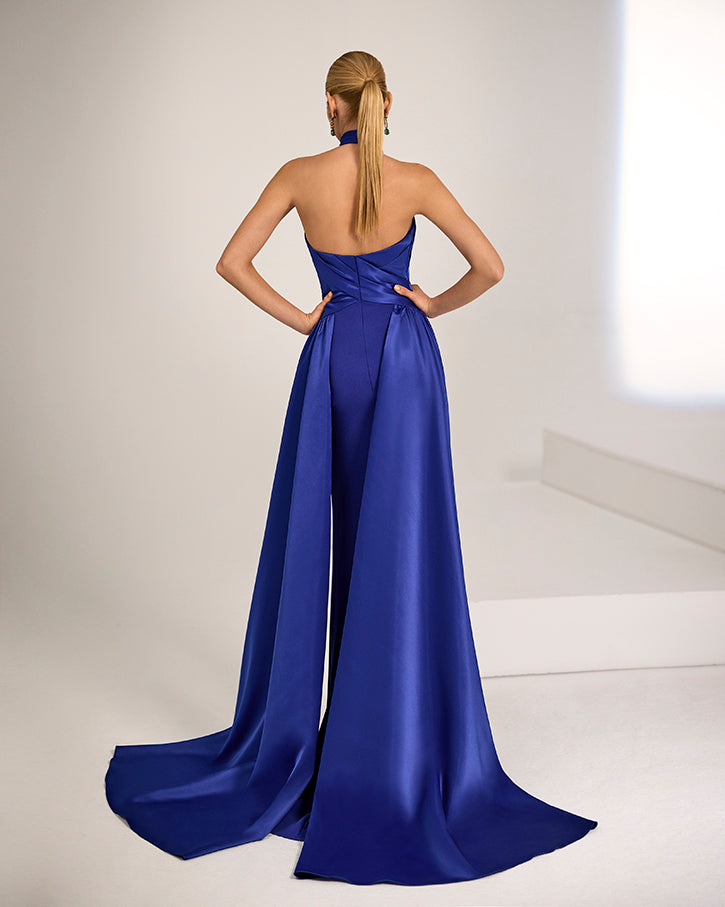 Escote cruzado y cola de satén.