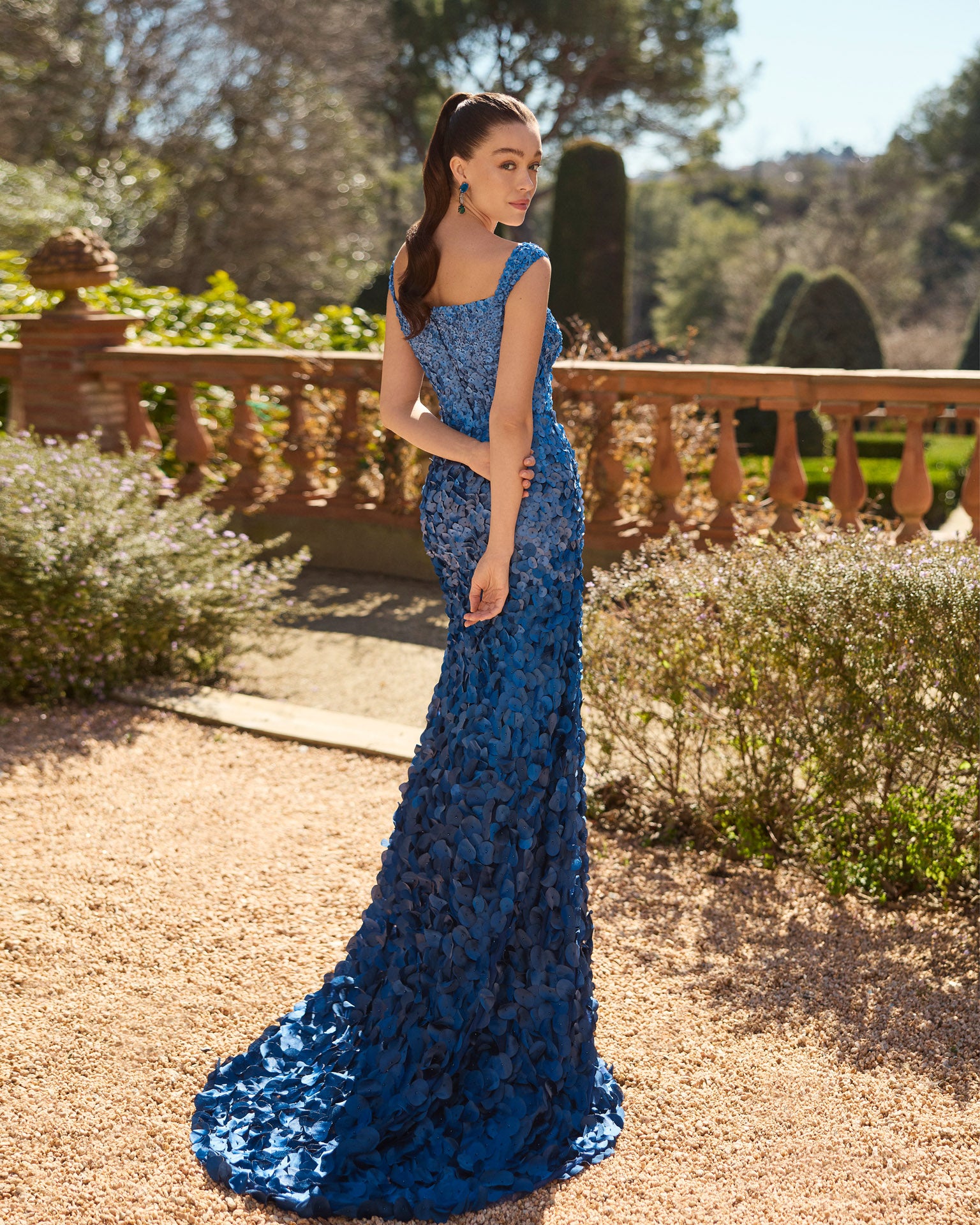 Vestido de fiesta largo, confeccionado en raso, con escote corazón, tirantes y espalda recta con abertura lateral en falda.