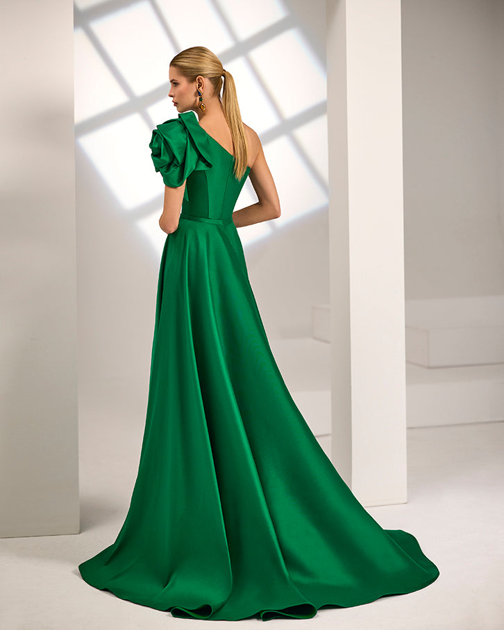 Vestido largo de fiesta de Marfil Barcelona, con escote asimétrico y flor en el hombro.