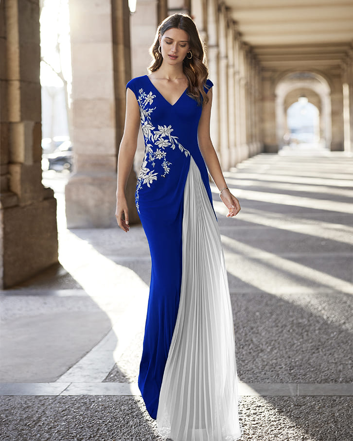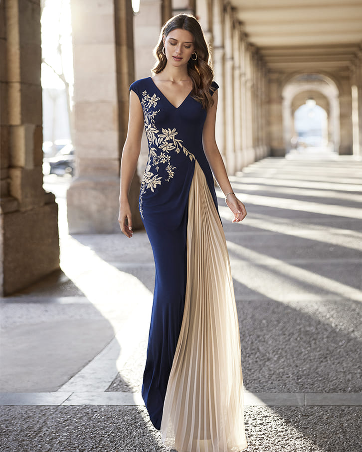 Vestido de fiesta largo, confeccionado en un punto elástico bordado.