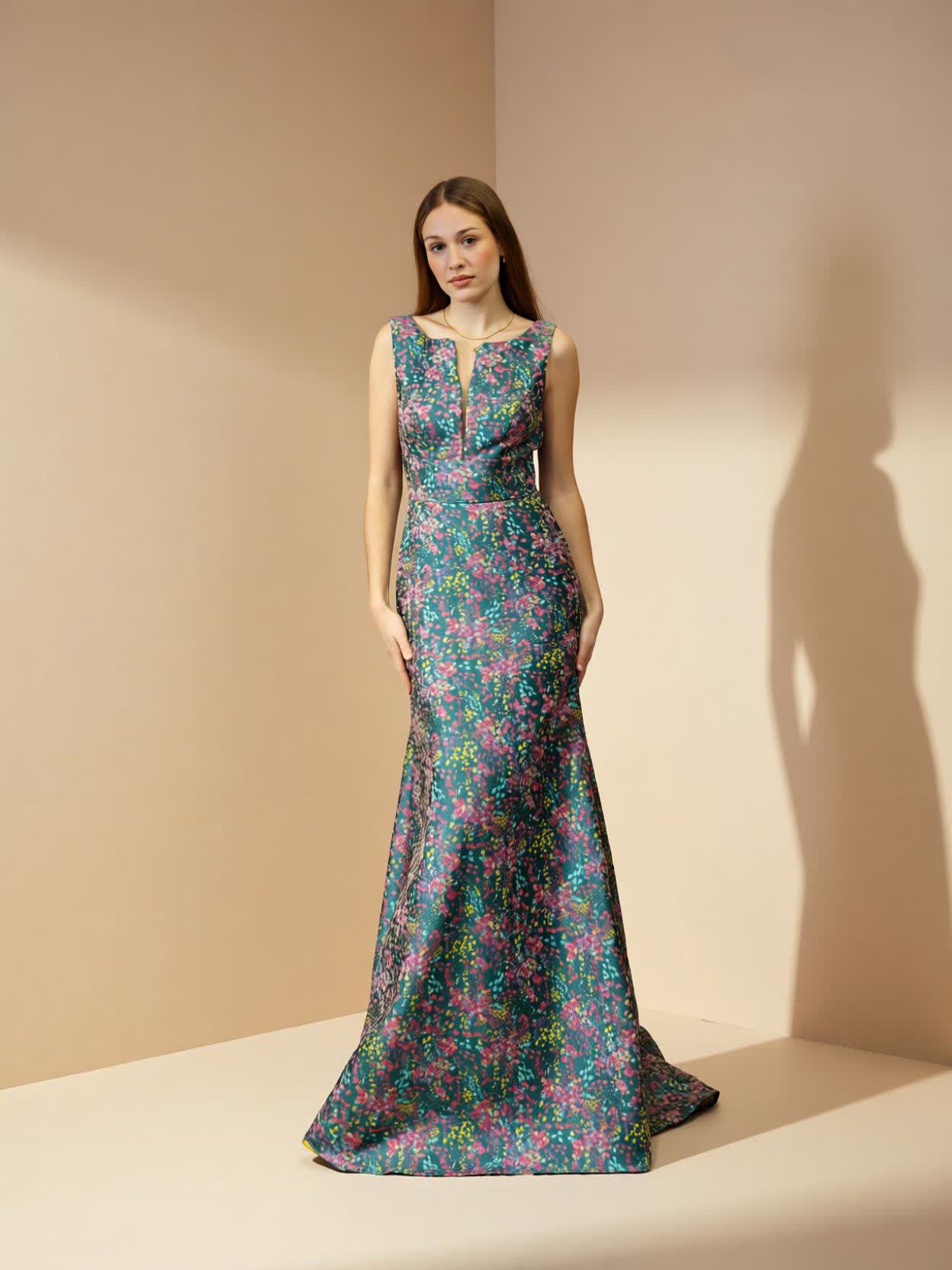 Modelo Marfil Barcelona con escote acuchillado y lazo en la espalda.