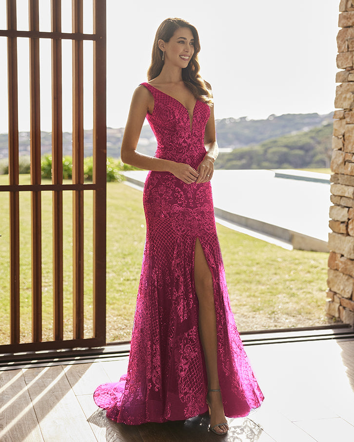 Vestido de cóctel largo confeccionado en tul enriquecido con pedrería.