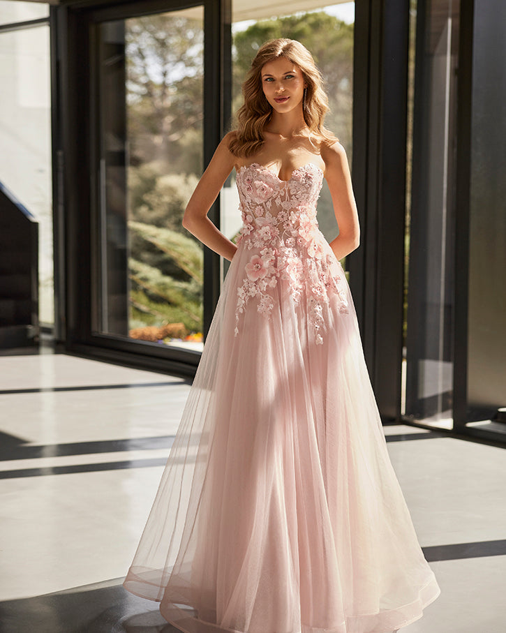 Con escote palabra d ehonor y espalda corset, conjuntando manga abullonada extraíble.