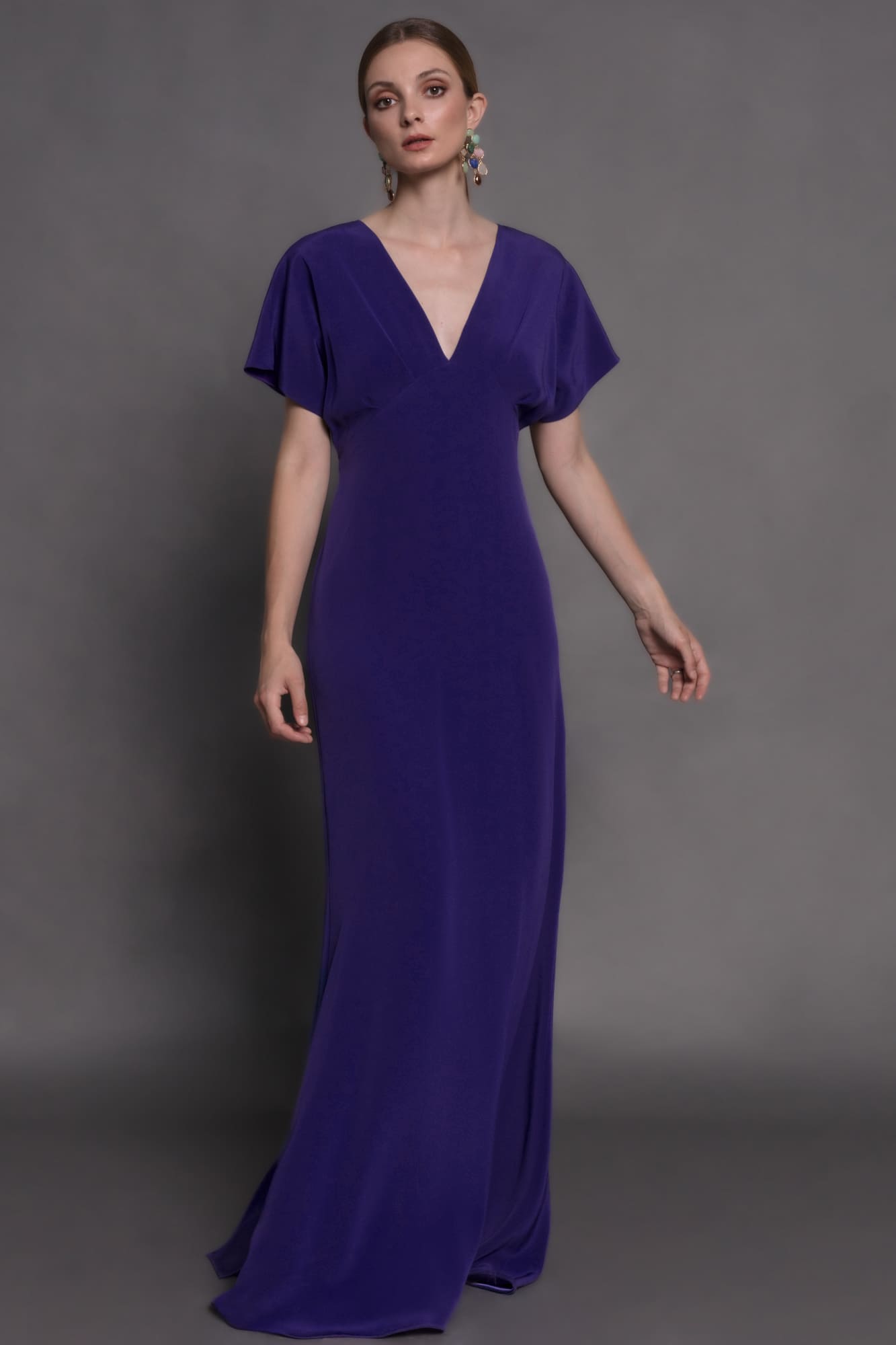 Mangas fluidas tipo mariposa. Esta pieza envuelve la silueta con una caída impecable y un movimiento ligero que realza cada paso. Ideal para bodas de tarde, eventos de gala o cenas especiales, su diseño minimalista y refinado destaca por su capacidad de transformar la sencillez en pura distinción.