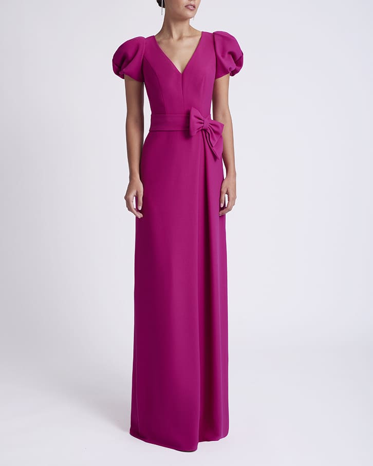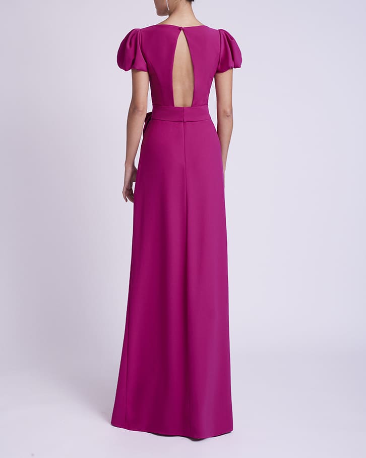 Vestido de fiesta de estilo sencillo, confeccionado en crepe con manga corta abullonada y lazo en cintura.