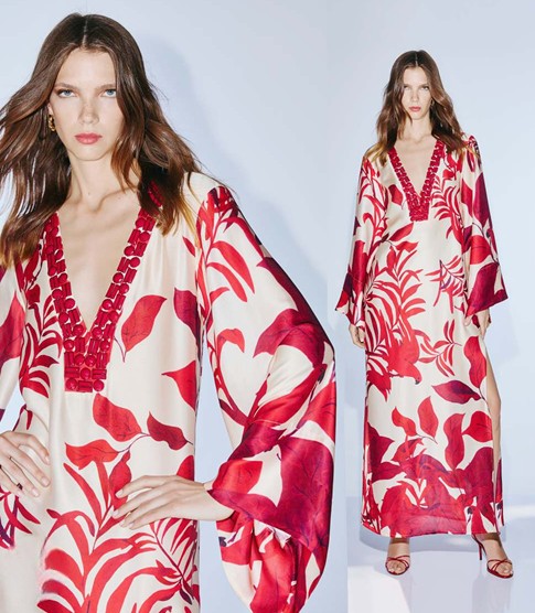 Vestido estampado con detalles de pedrería, estilo caftán.