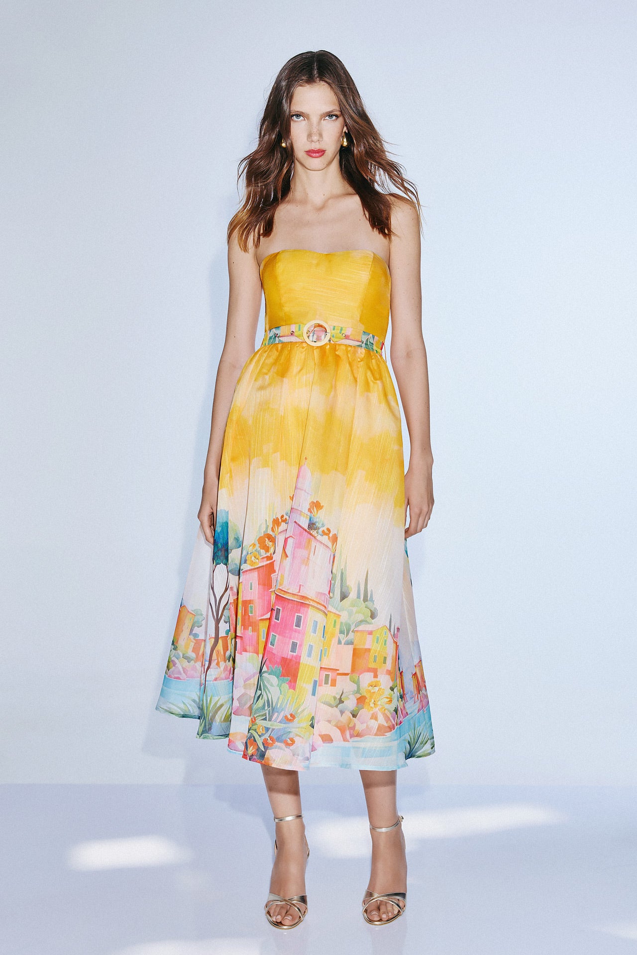Vestido midi en color amarillo con estampado tipo acuarela.